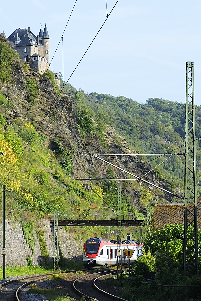 Der Stadler Flirt ET 7.01 der Eurobahn durchfährt als RE 13 Hamm - Venlo/NL (Maas-Wupper-Express) am 25.05.2014 Düsseldorf-Hamm. Im Hintergrund die in den letzten Jahren enstandene Düsseldorfer Hafen-City, der der Triebwagen einen weiteren Farbtupfer hinzufügt.