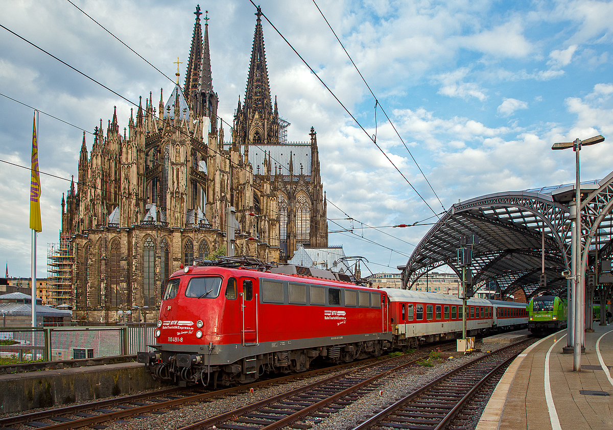 Früh morgens im Hbf Köln.... Die 110 491-8 der BahnTouristikExpress GmbH (BTE), ex DB 110 491-8, ex DB 114 491-4, ex DB 112 491-6, fährt am 22.05.2018 mit einem Sonderzug vom Hbf Köln in Richtung Hamburg los. Die Lok wurde 1968 von Krauss-Maffei in München unter der Fabriknummer 19356 gebaut, der elektrische Teil ist von den Siemens-Schuckert-Werke (SSW), und als 112 491-6 (als eine E 10.12) an die DB ausgeliefert, 1988 wurde sie in 114 491-4 umgezeichnet. Im Jahr 1994 erfolgte der Rückbau zur 110er unter Verwendung der Drehgestelle der 110 122, somit erfolgte Umzeichnung in 110 491–8. Im Jahr 2014 ging sie an die BahnTouristikExpress GmbH. Nach der Reaktivierung 2015 (und Umbau auf LED-Leuchten, sowie eckige Puffer) fährt sie unter der NVR-Nr. 91 80 6110 491-8 D-BTEX.