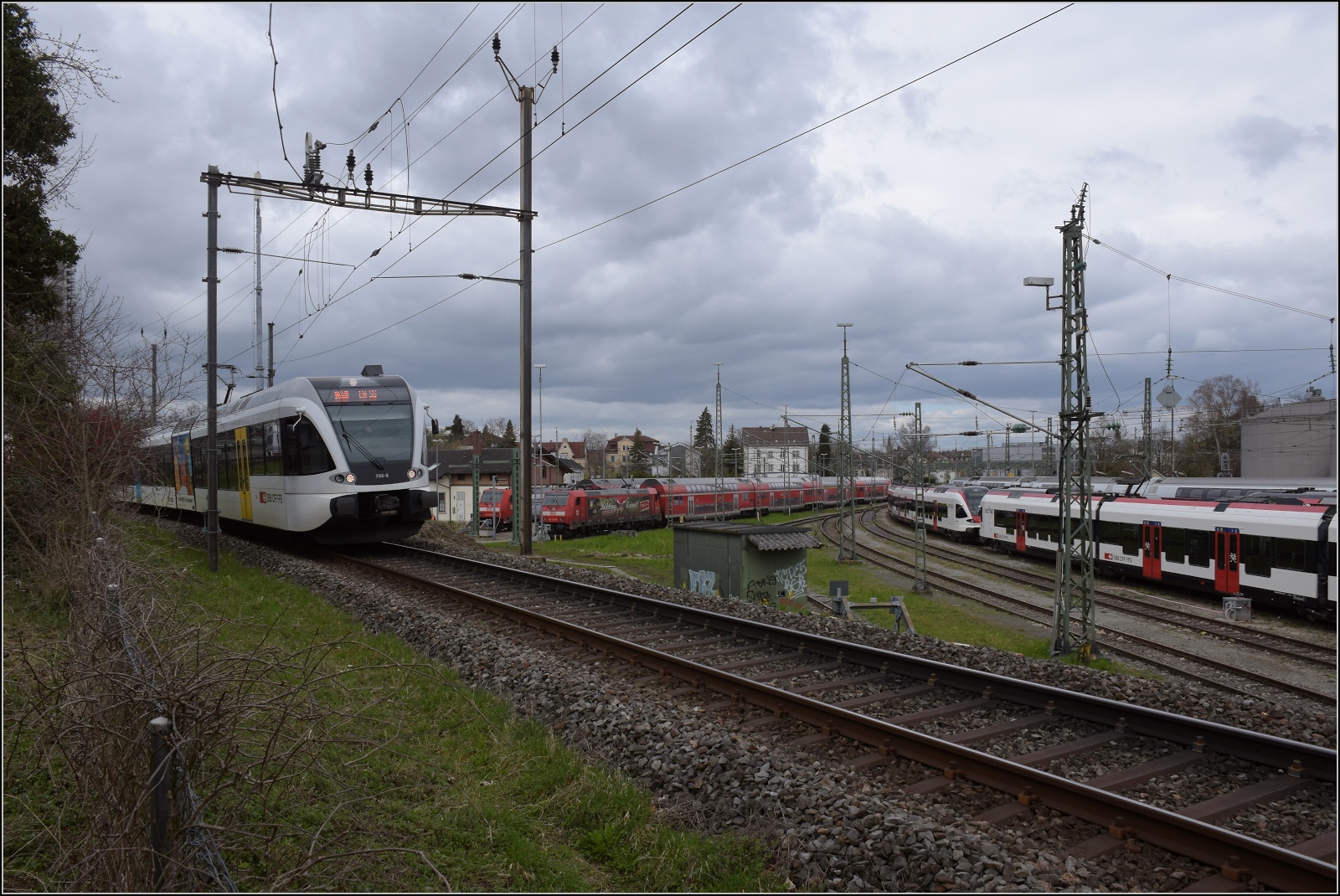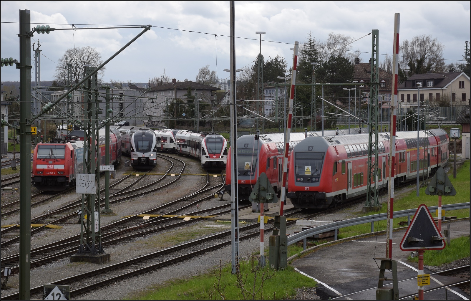 Die Abstellanlage des Bahnhof Konstanz auf Kreuzlinger Germarkung ist gut belegt. Von links 146 231 ohne einen streikenden Dosto-Steuerwagen, dafür mit 146 237(?) als Sandwich. 4010 005, versteckt RABe 521 208 'Singen', hintereinander RABe 521 203 und RABe 521 207, 146 239 und 146 230 jeweils mit Schwarzwaldbahnzug. März 2023. Olli