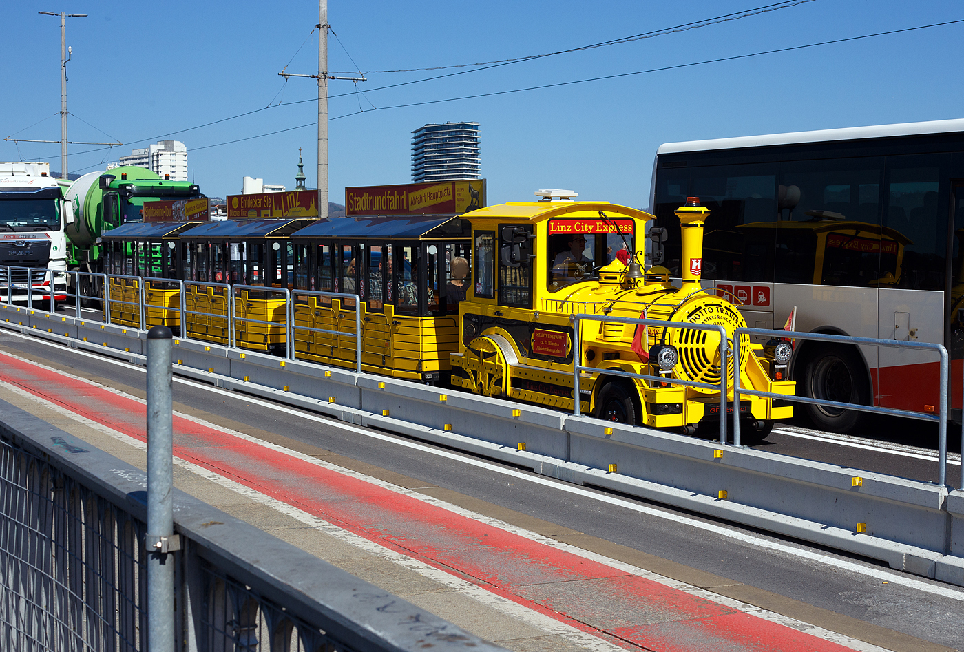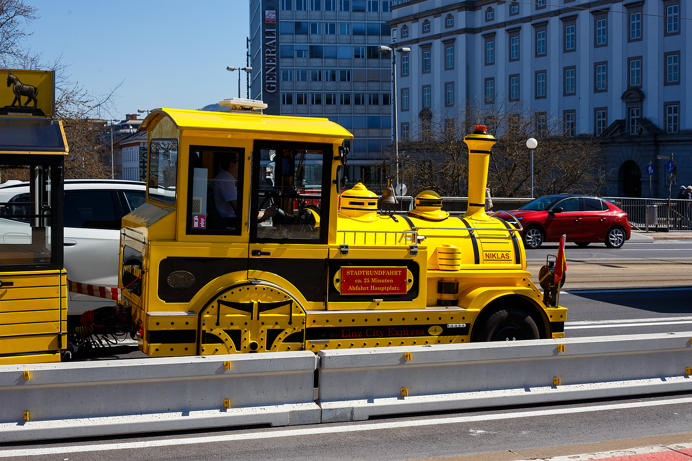 Ein Petit Train (ein Muson River 1894 vom italienischen Hersteller DOTTO TRAINS mit 3 Anhänger) am 25.03.2015 beim alten Hafen von Marseille (le Vieux-Port de Marseille). Mit ihm kann man für 8 Euro von hier hinauf auf die höchste Erhebung (161 m) von Marseille fahren, wo sich die Marien-Wallfahrtskirche Notre-Dame de la Garde befindet.