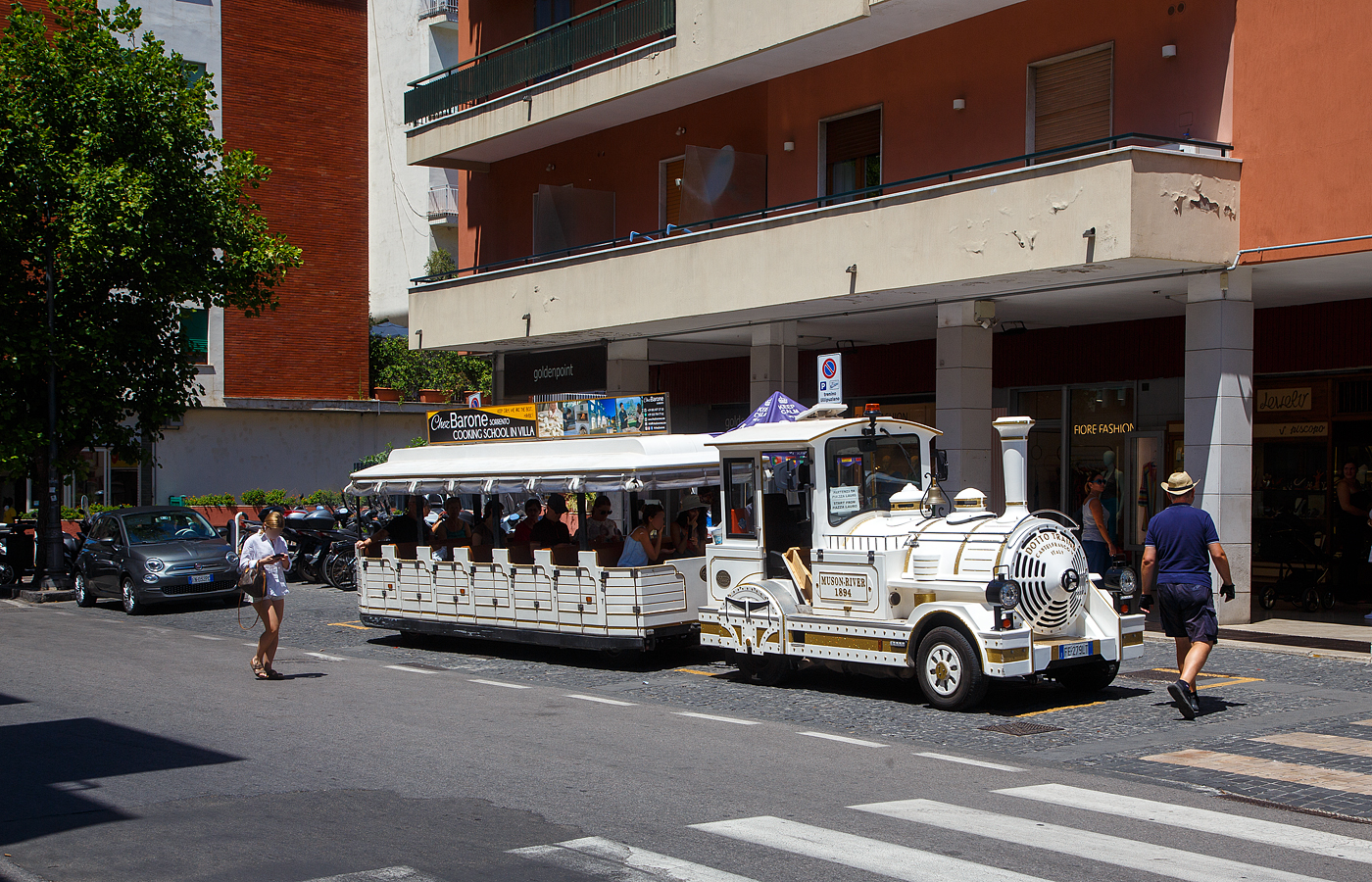 Ein Petit Train (ein Muson River 1894 vom italienischen Hersteller DOTTO TRAINS mit einem Anhänger) erreicht am 28 Mai 2023 den Bahnhof Aigle. Er ist aber wohl keine Konkurrenz zur AL - Aigle–Leysin-Bahn.