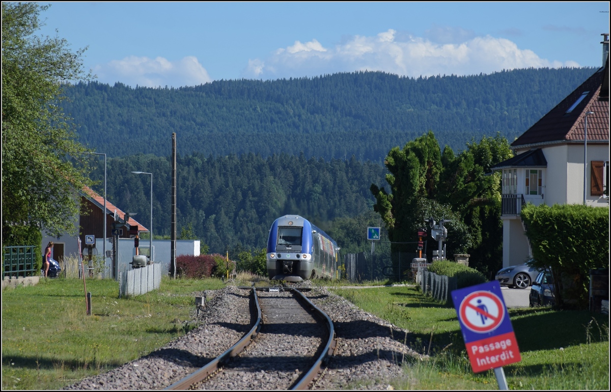 Nein, es ist kein Bild eines normalen Wohnhauses, es ist heute ein Wohnhaus mit Gleisanschluss, es ist ganz offenbar das ehemalige Empfangsgebäude von Longemaison. Einen Bahnsteig findet man jedoch nicht mehr und müsste in Avoudray oder Gilley einsteigen. August 2024.