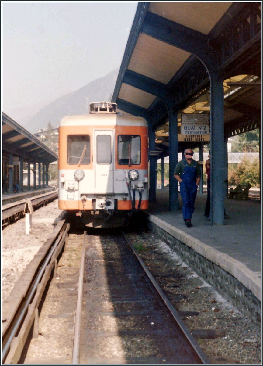 Rendevouz eines Z 600 der SNCF (noch in alter Farbgebung und mit SNCF-Symbol an der Front) und eines BDeh 4/4 der MC im Bahnhof Le Chatelard-Frontiere (Mai 1980), vor der Abfahrt in Richtung Chamonix bleibt noch Zeit für eine Unterhaltung zwischen Zollbeamten und Zugperonal