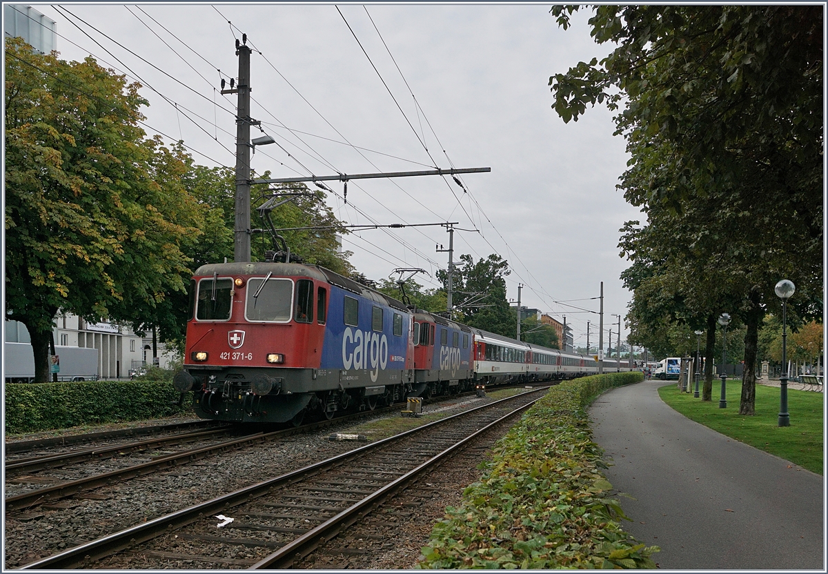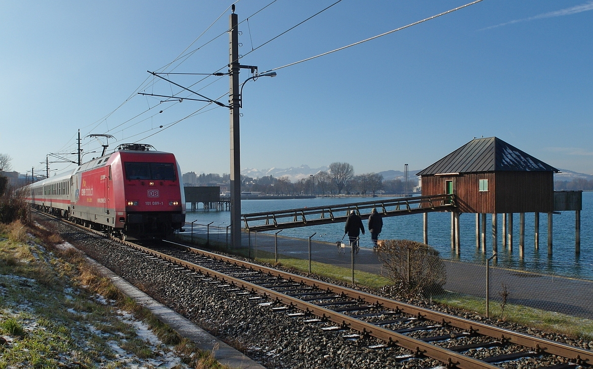 Von der Bereitstellung im Bahnhof Wolfurt kommend fährt am 19.07.2012 der Railjet, kurz nach der Durchfahrt von Bregenz-Hafen, zu seinem Startbahnhof Lindau, um dann seine Fahrt nach Wien zu beginnen.