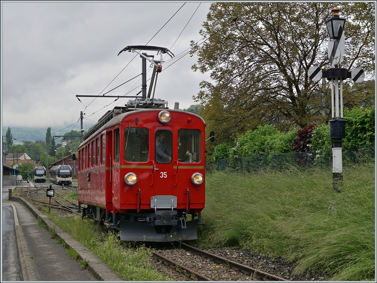 Das Bild zeigt den BDe 4/4 141 in Blonay, beim Abwarten eines Gegenzuges.