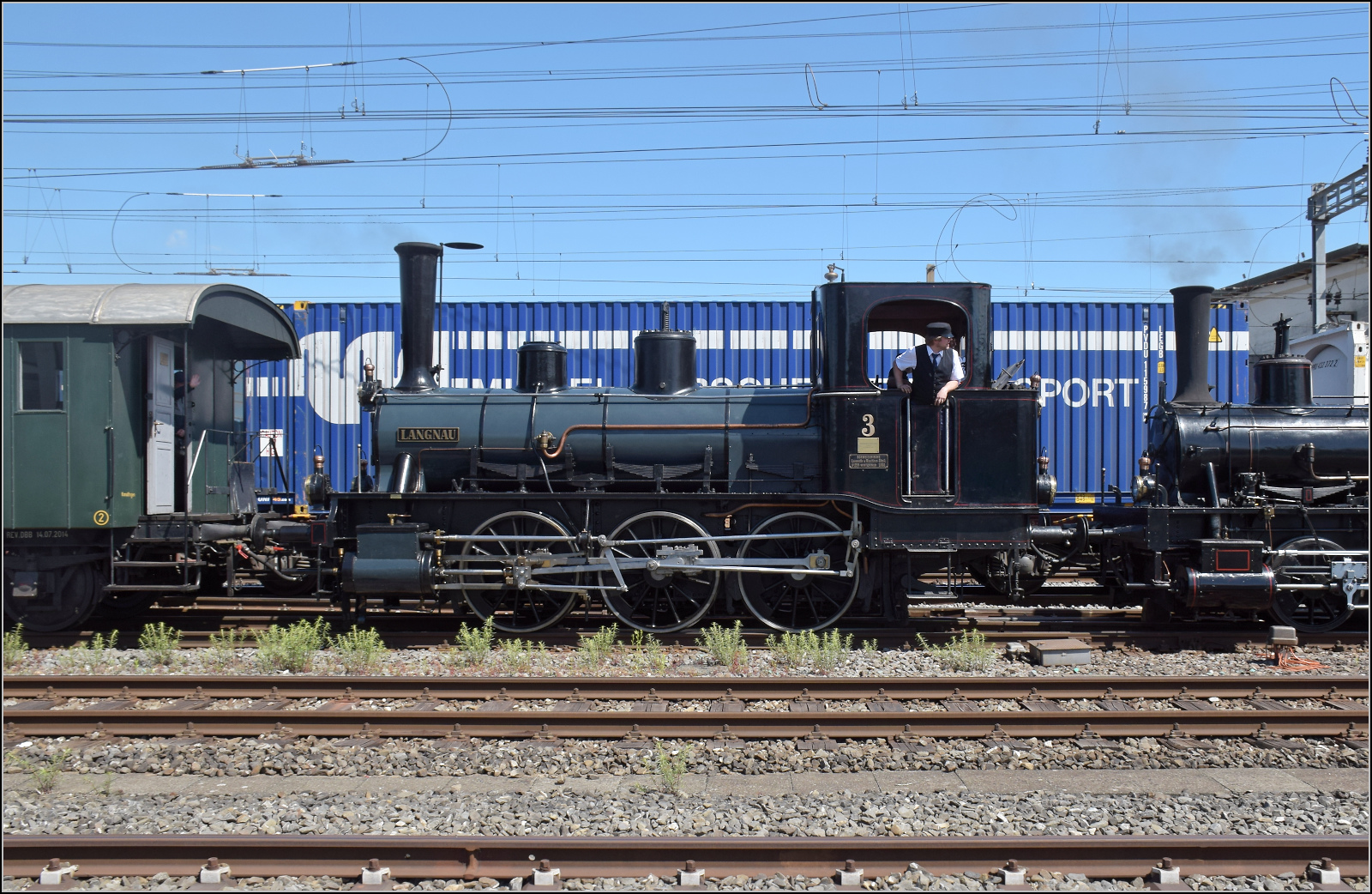 E 3/3 853 der Jura-Simplon und Ed 3/3 3 'Langnau' der Emmentalbahn (im Bild) rangieren im Bahnhof Burgdorf den Sonderzug in die Abstellgruppe. Mai 2025.