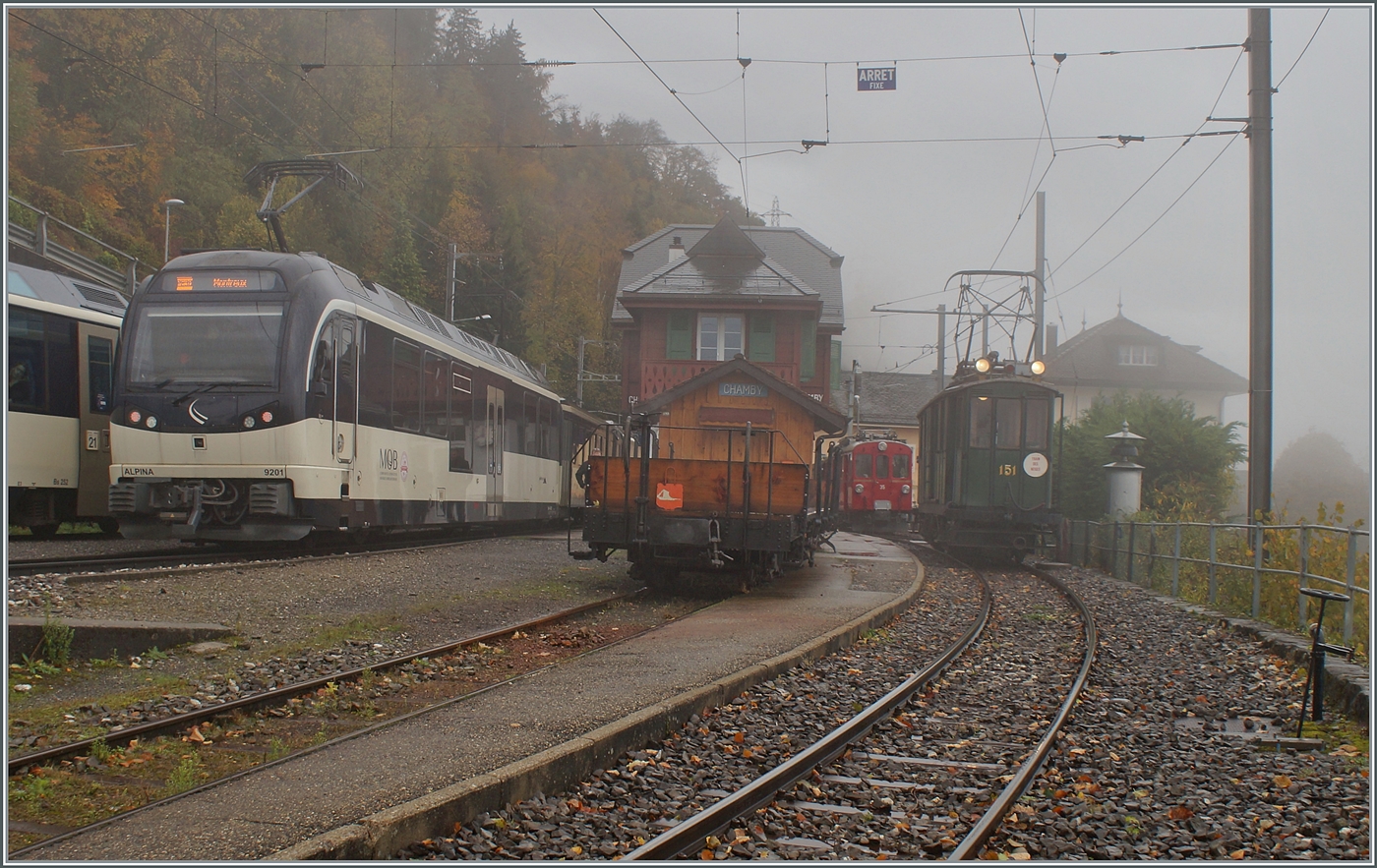 Les chemins de fer disparus - Die verschwundenen Bahnen (Réseaux Breton 1891 - 1964 / CEV St-Légier - Châtel St-Denis 1904 - 1969) die kleine Dm 2/2 N° 3 Biniou steht symbolisch für die meisten "verschwundenen Bahnlinien" an diesem Herbstevent: allein in der Heimat des Biniou sind in der Bretagne sind gegen 425 km verschwunden, dazu kommt noch die Strecken von St-Légier nach Châtel st-Denis, bei welcher die Dm 2/2 n° 3 aktiv beim Abbau mithelfen musste. Etliche Gleise dieser Strecke konnten übrigens beim Bau des Museumsbahnhofs von Chaulin verwendet werden. Im Bild zeigt sich die Dm 2/2 N 3 in Chamby um später nach Chaulin zu fahren.