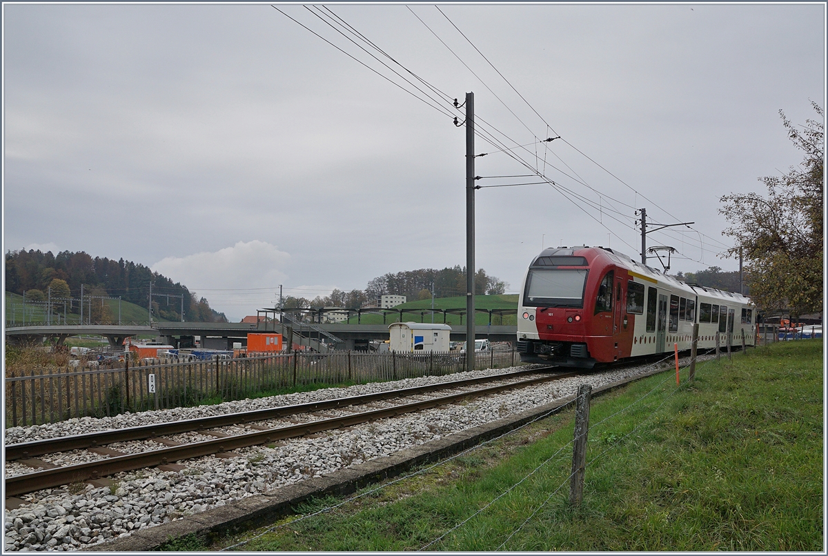 Ein TPF SURF ABe 2/4 - B - Be 2/4 verlässt Châtel-St-Dennis in Richtung Bulle, im Hintergrund ist der neue Bahnhof im Bau.