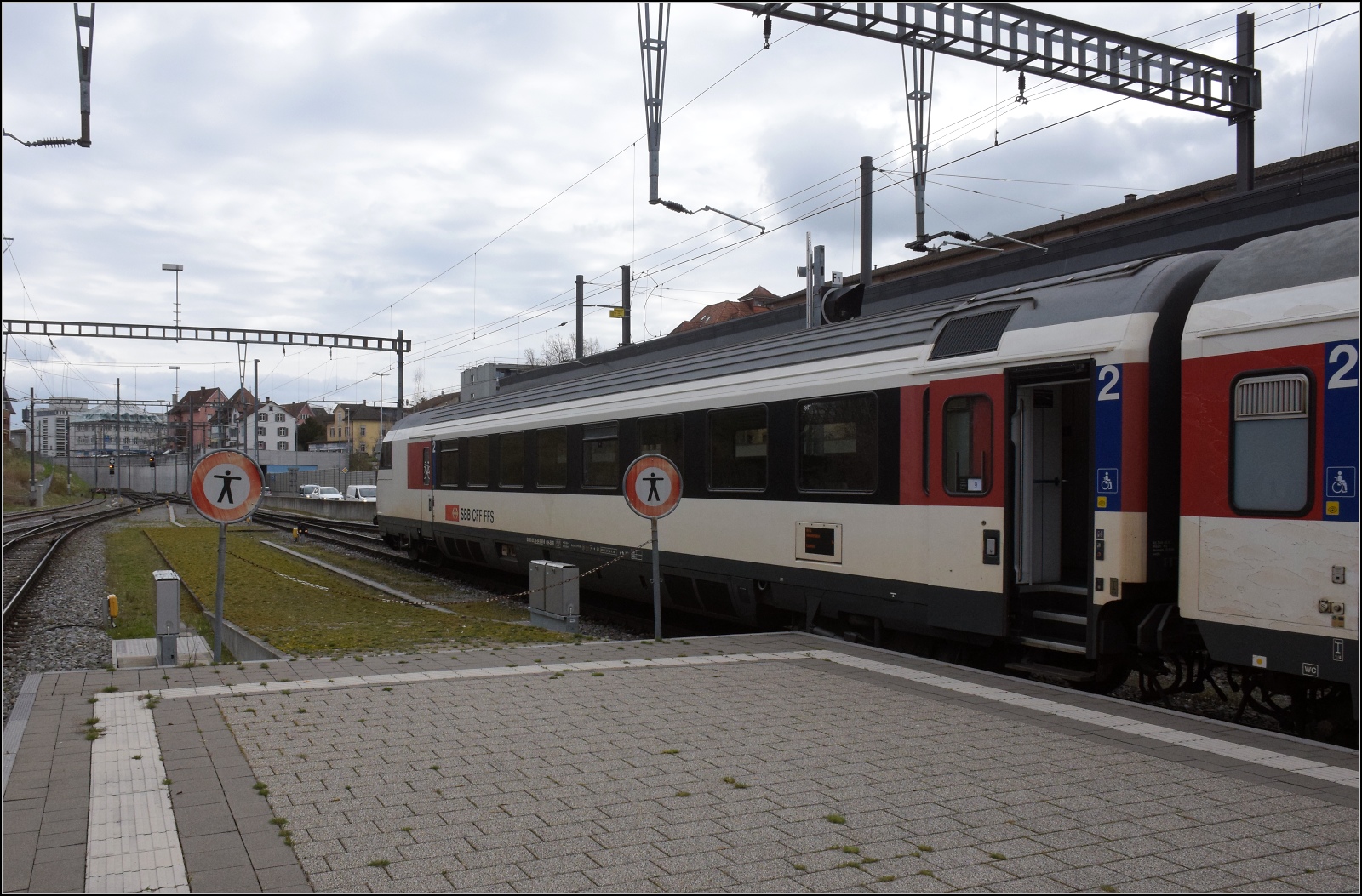 In Kreuzlingen steht der Steuerwagen von Re 460 100 nicht am Bahnsteig, offenbar eine kleinere Streikfolge, dazu vom anderen Ende des Zuges die vermutliche Erklärung. März 2023. Olli
