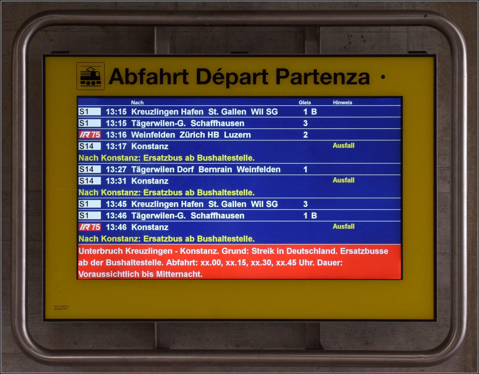Die Abfahrtstafel in Kreuzlingen streicht alle Züge nach Konstanz und kündigt den viertelstündlichen Schienenersatzverkehr an. Sehr lobenswert. März 2023. Olli