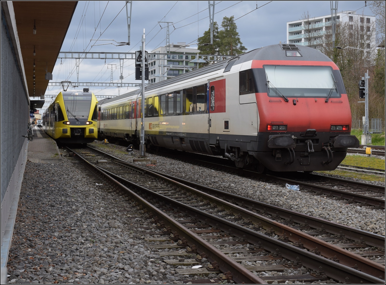 Züge von und nach Konstanz enden bereits in Kreuzlingen. Hier steht ein IR aus EW IV mit Re 460 100 im Bahnhof. Man beachte die Position des Steuerwagens. Der zweite Zug ist eine Doppeltraktion kurzer Thurbo-GTW mit dem gelben RABe 526 707 und RABe 526 746. März 2023. Olli