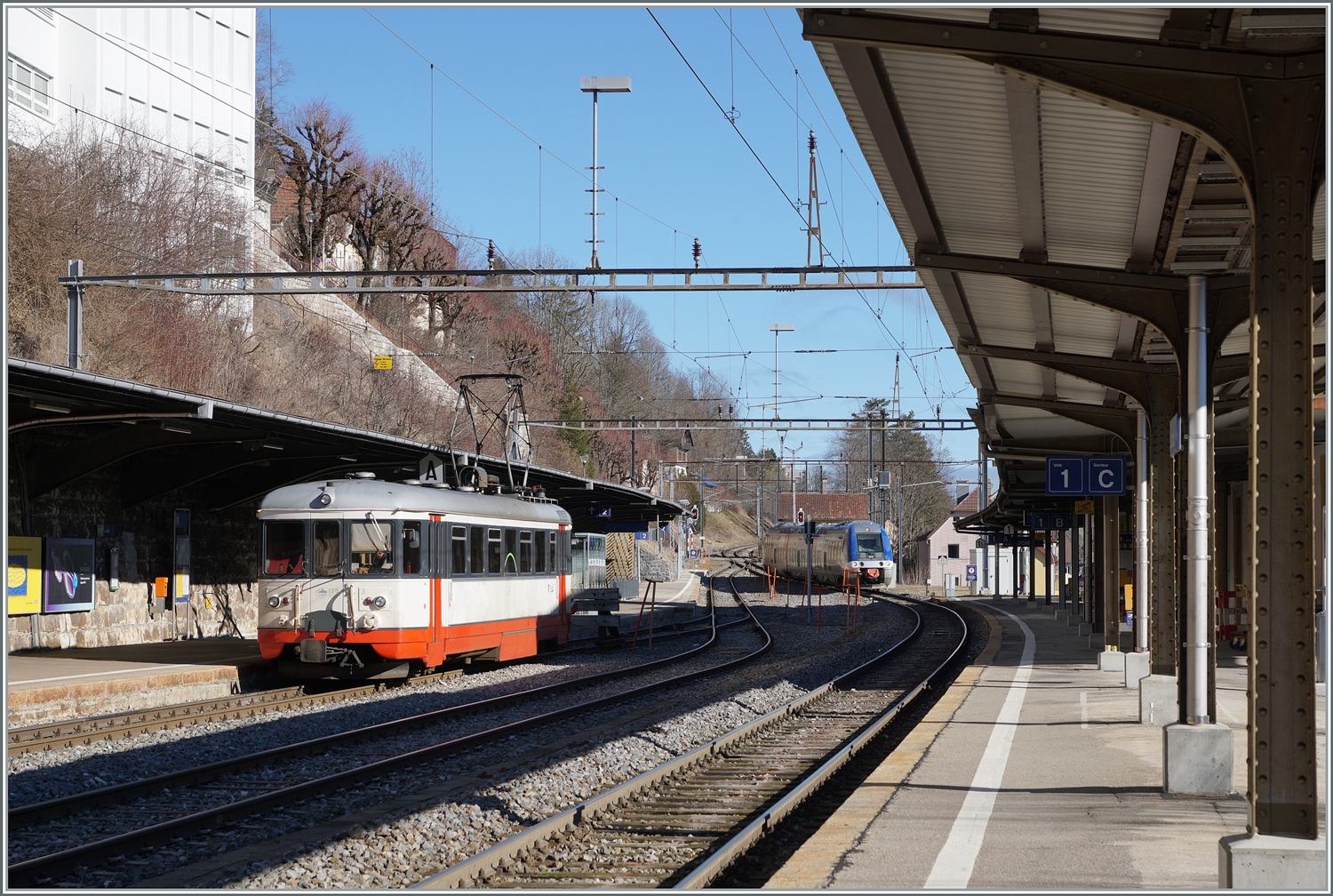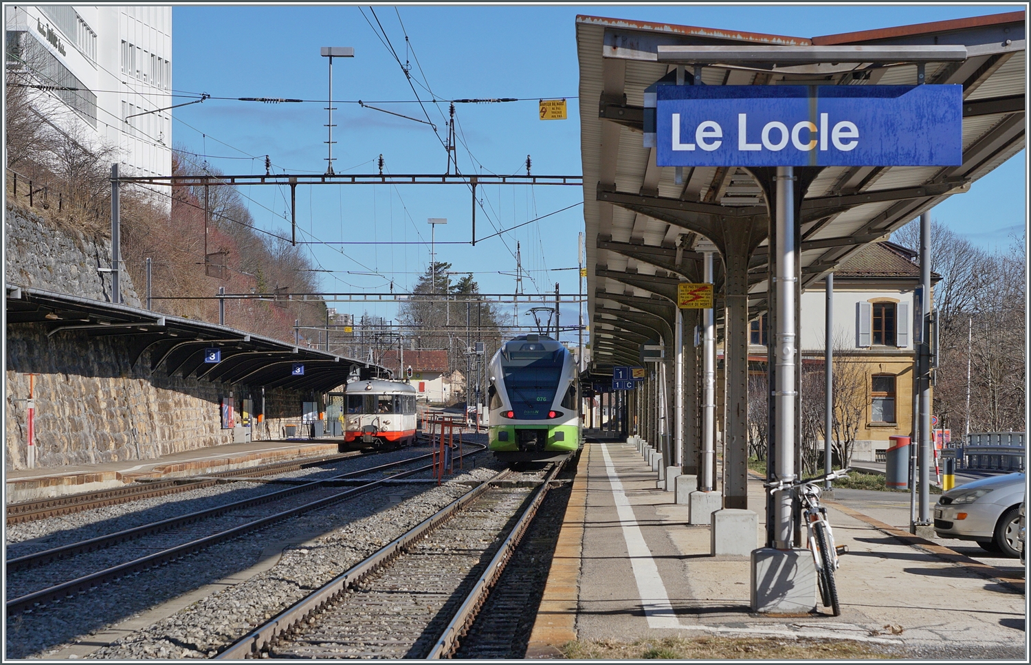 BDe 4/4 5 der "Régional des Brenets", heute TransN, hat bald ausgedient und ein Bus wird auf der Bahnstrecke fahren. Der jüngere TransN-Bruder vom Typ Flirt I, RABe 527 331 trifft derweil in Le Locle ein. Mai 2023.