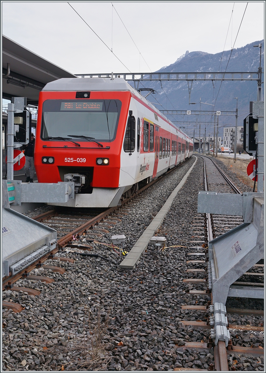 Die TMR RABe 525 039 und 252 040 erreichen als R81 26117 von Le Châble ihr Ziel Martigny. Nach einer kurzen Wendezeit von vier Minuten werden die beiden NINA-Triebzüge wieder nach Le Châble zurückfahren.