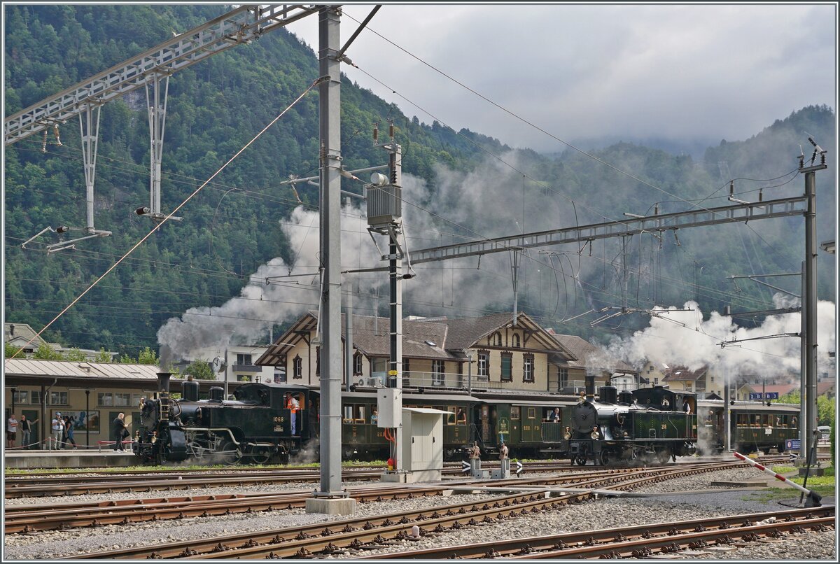 Lokwechsel! Und schon dampft die HG 3/3 1068 der der BDB (Brünig Dampf Bahn) heran um den Zug für die Bergfahrt zu übernehmen.