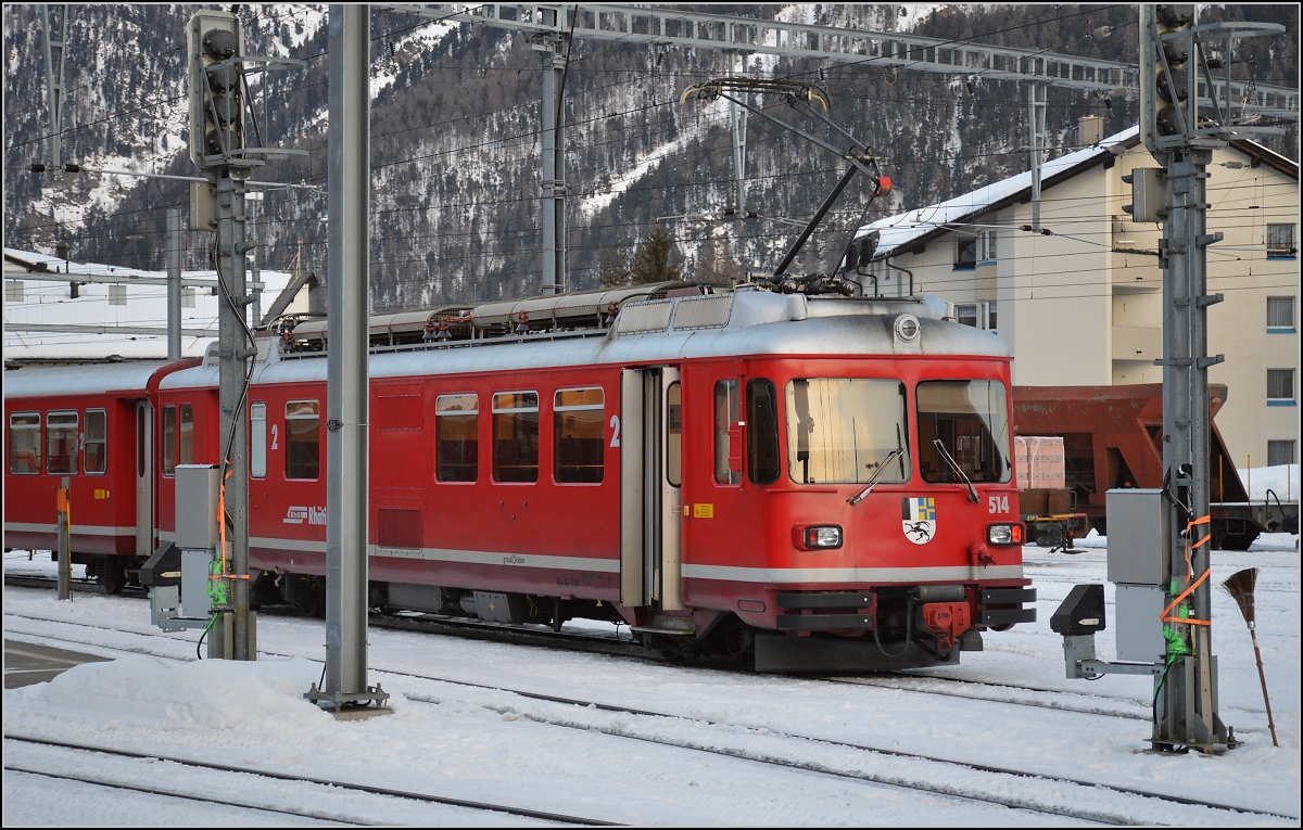 Alvra Gliederzug der RhB in Samedan, unter anderem als Besonderheit gibt es ein Stehplatz-Fotografenabteil am lokseitigen Ende, bei dem man die Fenster per Knopfdruck öffnen kann. Januar 2020.