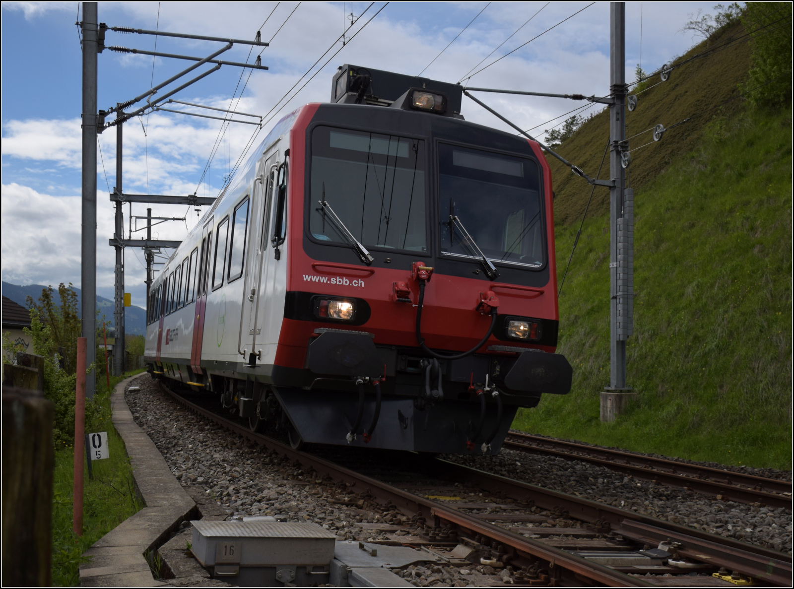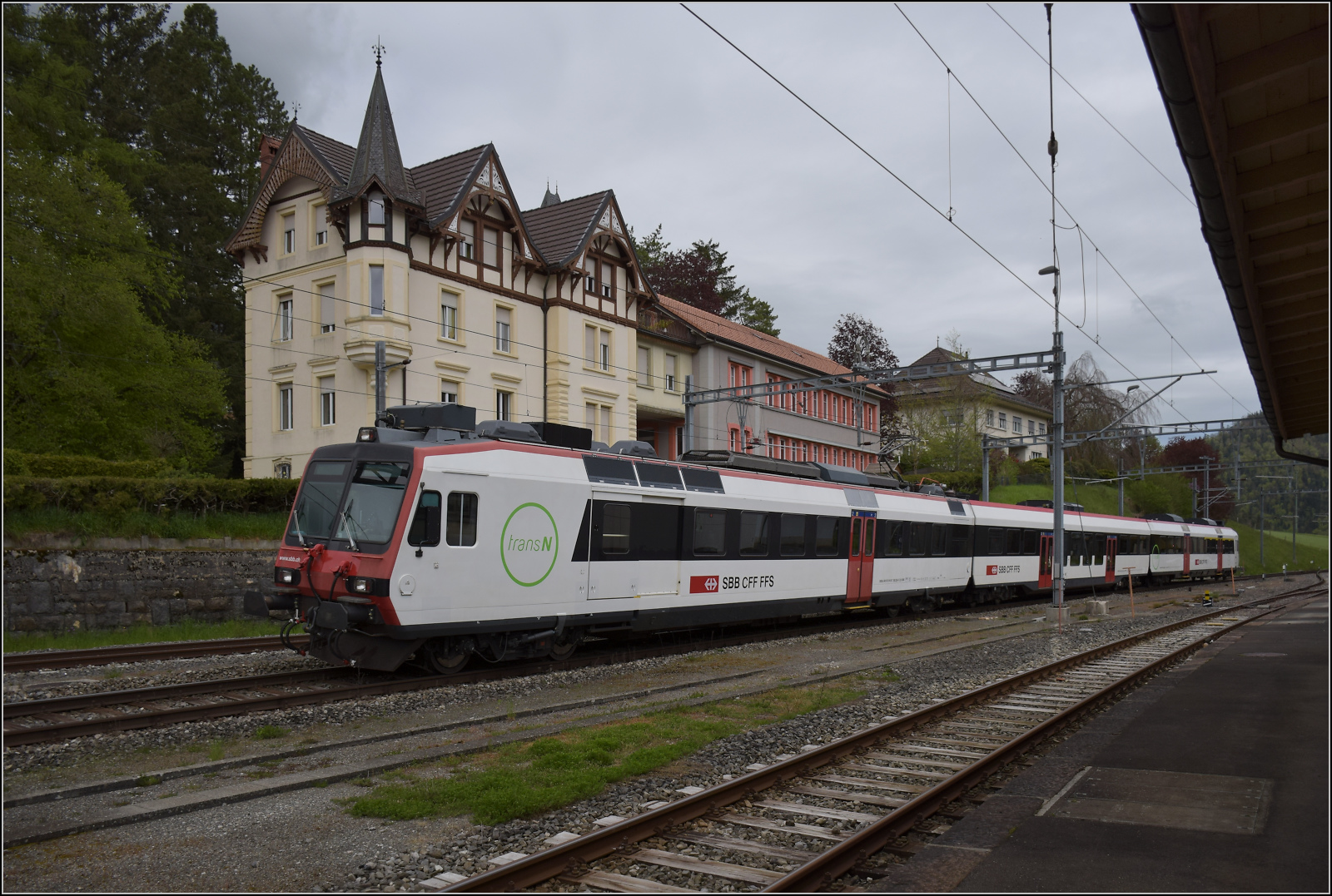 RBDe 560 254 mit TRN-Logo auf dem Rückweg von Buttes in Travers. Mai 2024.