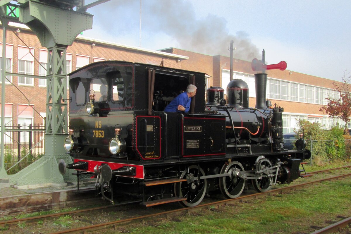 Museumbuurtsporweg MBS 7853 lauft am 23 Oktober 2016 um in Haaksbergen. In 1945 kauften die Niederländische Staatseisenbahnen zwei ex-JS, ex-SBB Tigerli (8438 und 8439). In 1948 wurden die beide Dampfloks ausgemüstert. In 1910 wurde ein Tigerli für Alusuisse gebaut und in 1996 von die MBS gekauft. Weil es kein Originallok war wurde die jetzt Niederländische Tigerli (auch Navizence genannt) als 7853 eingereiht und ist heute betriebsfähig, wie sie hier in Haaksbergen unter Beweis stellte. Leonardus Schrijvers