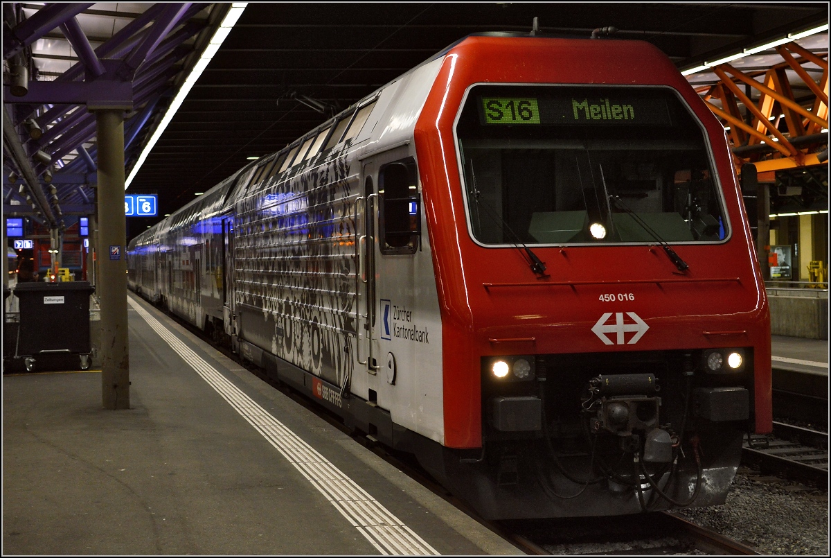 Re 450 016 führt einen aussergewöhnlich dekorierten S-Bahn-Zug an. Winterthur, Oktober 2014.