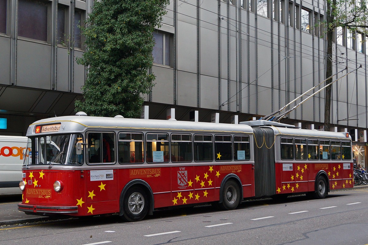 Stadtbus Winterthur: FBW Museumstrolleybus 101 als Adventsbus, aufgenommen am 10. Dezember vor dem MANOR-Kiosk Winterthur. Da die Trolleybusse in der Schweiz dem Eisenbahngesetz unterstehen, wird diese Aufnahme in diesen Kategorien gezeigt. Bahnsujets der Woche 50/2014 von Walter Ruetsch