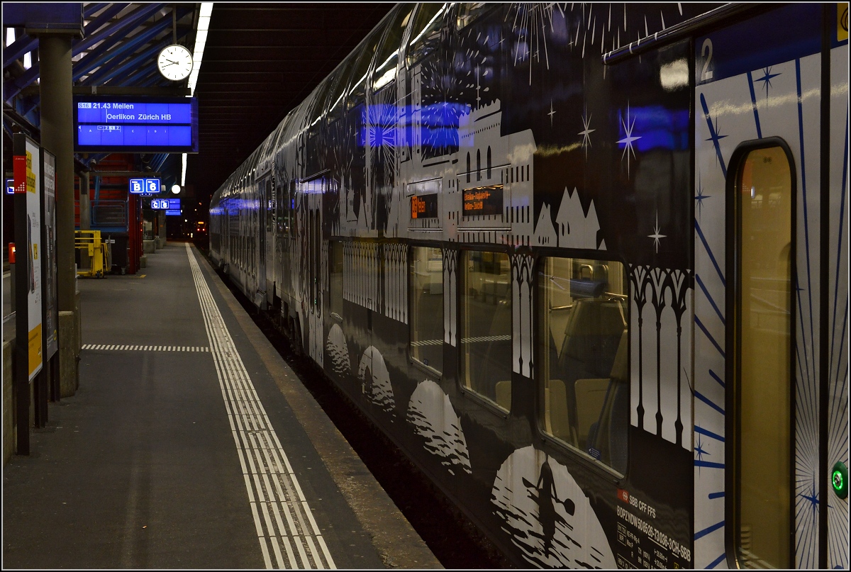 Stadtbus Winterthur: FBW Museumstrolleybus 101 als Adventsbus, aufgenommen am 10. Dezember vor dem MANOR-Kiosk Winterthur. Da die Trolleybusse in der Schweiz dem Eisenbahngesetz unterstehen, wird diese Aufnahme in diesen Kategorien gezeigt.