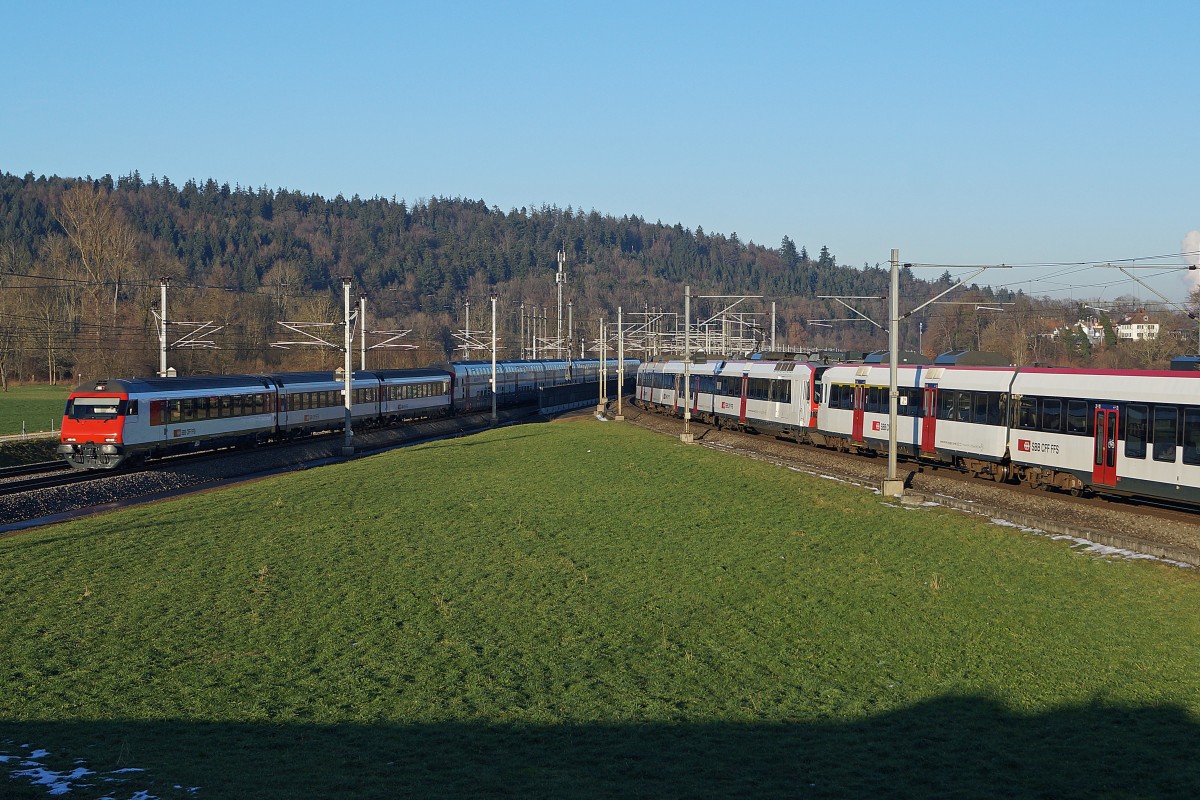 SBB: Die SBB Neubaustrecke  BAHN 2000  Mattstetten-Rothrist und die alte Stammstrecke Bern-Zollikofen-Burgdorf-Aarburg-Oftrigen-Olten treffen bei Roggwil aufeinander und verlaufen einige wenige Kilometer parallel. Am 5. Januar 2015 kam es in der letzten Abendsonne zu einer Begegnung zwischen einem Regionalzug Langenthal-Olten und einem in Richtung Bern brausenden IC mit einem EW IV-Modul.