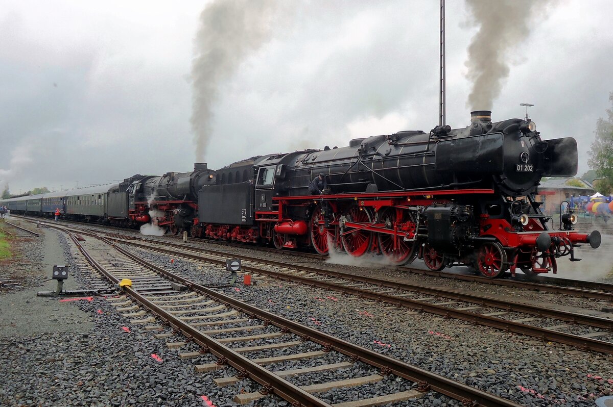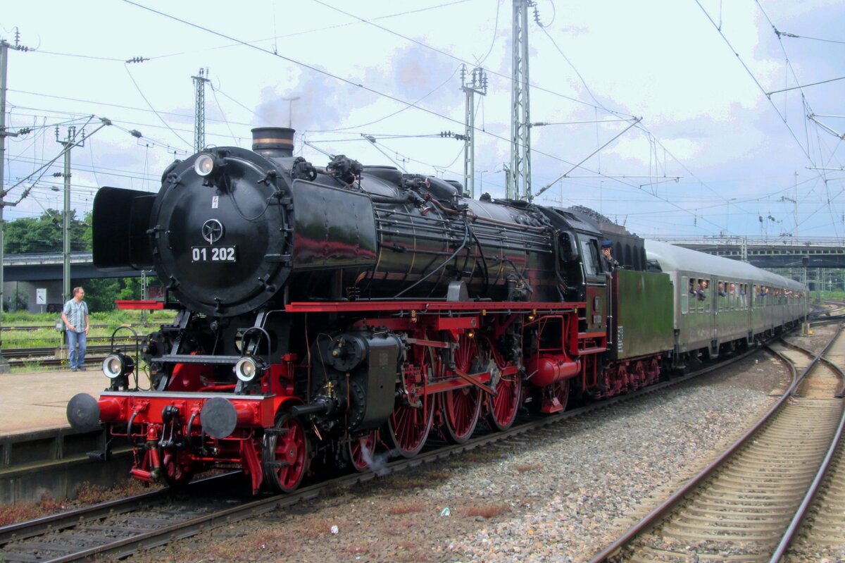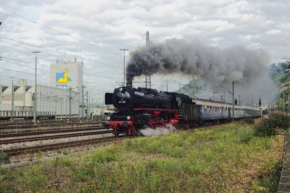 Endlich wieder Züge auf dem Schweizerbähnle (Etzwilen-Singen). 01 202 hat den Hauptbahnhof verlassen, der Lückenschluss wird gleich getestet. Singen, August 2020.