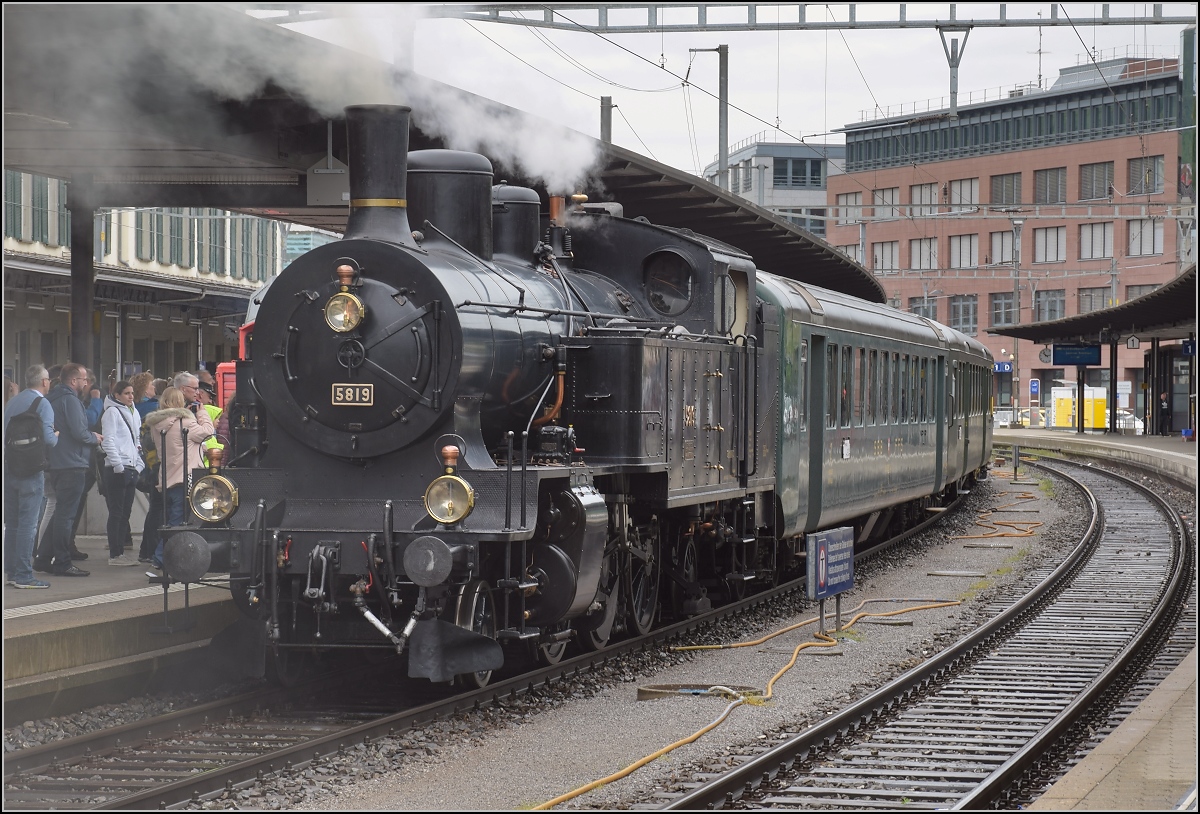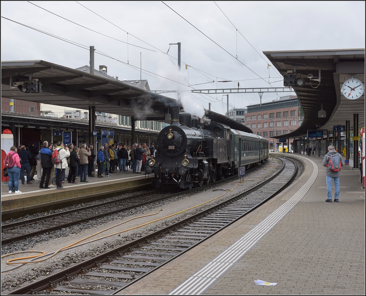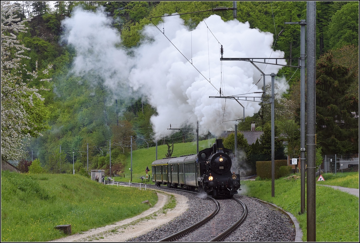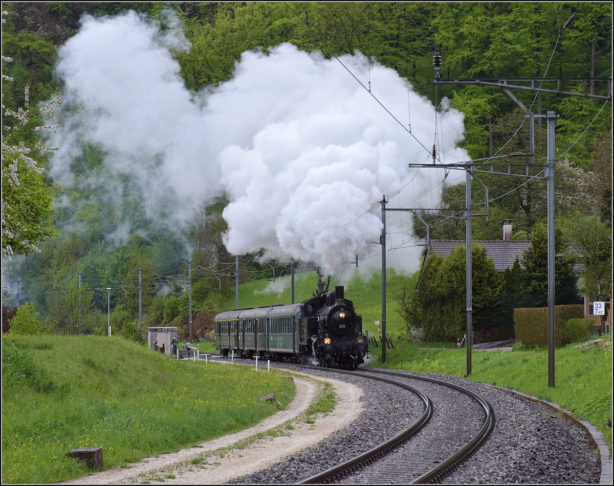 Fahrleitungsstörung nannte sie die Veranstaltung, um an die Dampfreserve in Olten für solche Fälle zu erinnern. Durchfahrt des Sonderzugs in Pratteln mit Eb 3/5 3819. Die bekannte Stelle in der Güterstrasse sorgt für spannende Bilder. April 2019.