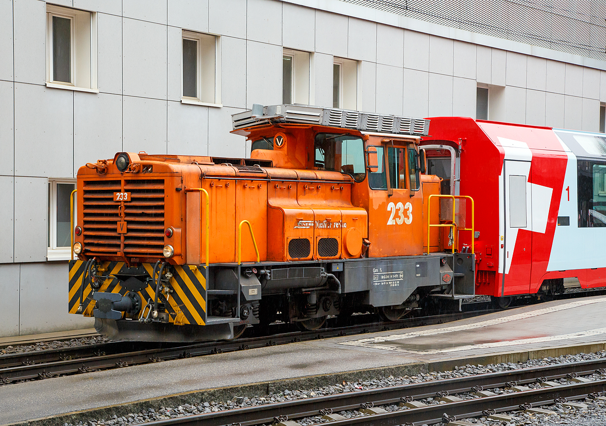Die RhB Gm 3/3 – 233 rangiert am 17.02.2017 den Glacier-Express Panoramawagen MGB Api 4040 im Bahnhof Chur.