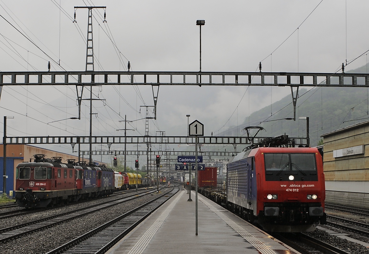 Abwechslungsreiche 17 Minuten in Cadenazzo: Am 08.05.2019 um 17.27 Uhr durchfuhr 474 012 den Bahnhof mit einem Güterzug Richtung Luino, links sind zwei 420 und eine 620 abgestellt Horst Lüdicke