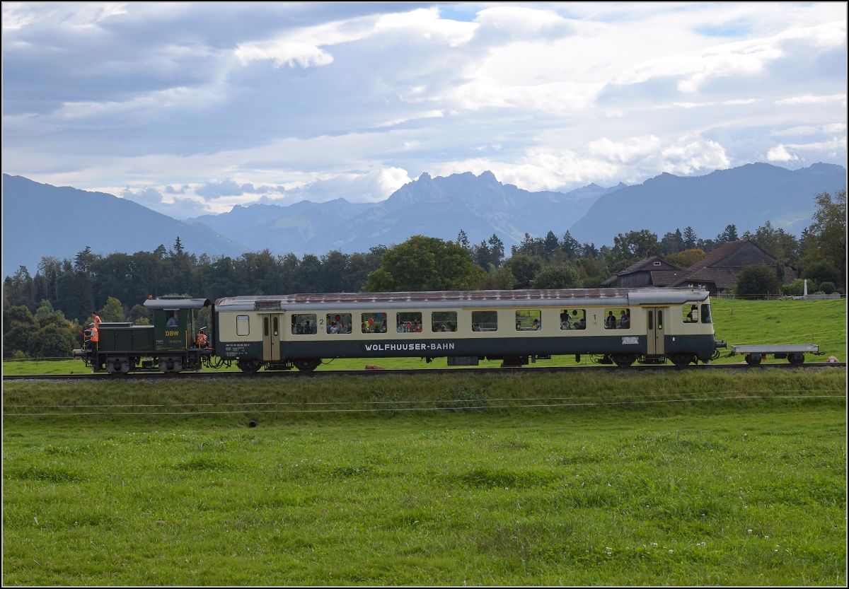 Fahrtag Wolfhuuser Bahn. In der Wiese beim Ritterhaus Bubikon sei ein näherer Blick auf den Tm 2/2 111 und den ABt der Wolfhuuser Bahn gestattet. Für Velotransporte gibt es noch einen kleinen "Beistellwagen". Oktober 2021.