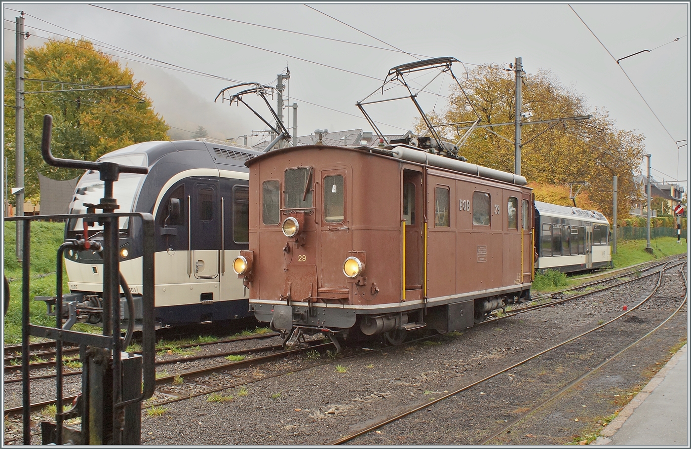 Die BOB HGe 3/3 29 der Blonay-Chamby Bahn bei Vers-chez-Robert auf der Fahrt nach Blonay.