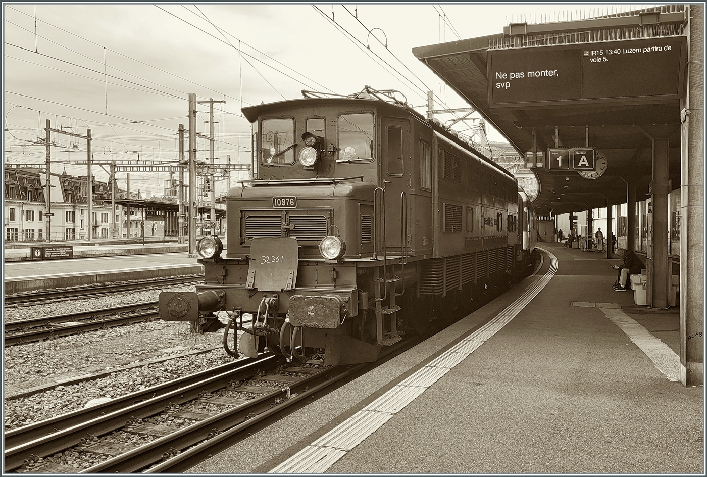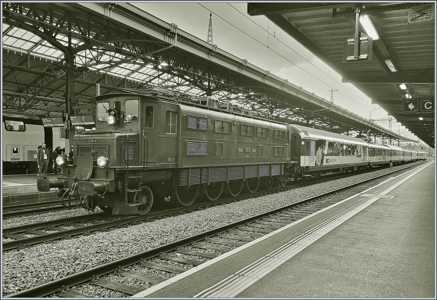 Die Ae 4/7 10997 ist mit den edlen Wagen "Le Diamant Bar" WRm 61 85 88-94 003-4 CH-IRIS und "Le Salon Bleu" ARmz 61 85 88-90 200-6 CH-IRIS unterwegs und macht in Lausanne einen kurzen Halt.