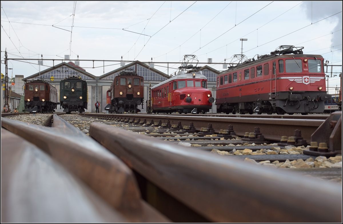 Die Be 4/7 12504 mit zwei Güterwagen in Lausanne. Baujahr 1922; mit einem Gewicht 111 Tonnen leist die Lok max 2400 PS und kann bis zu 80 km/h schnell fahren.