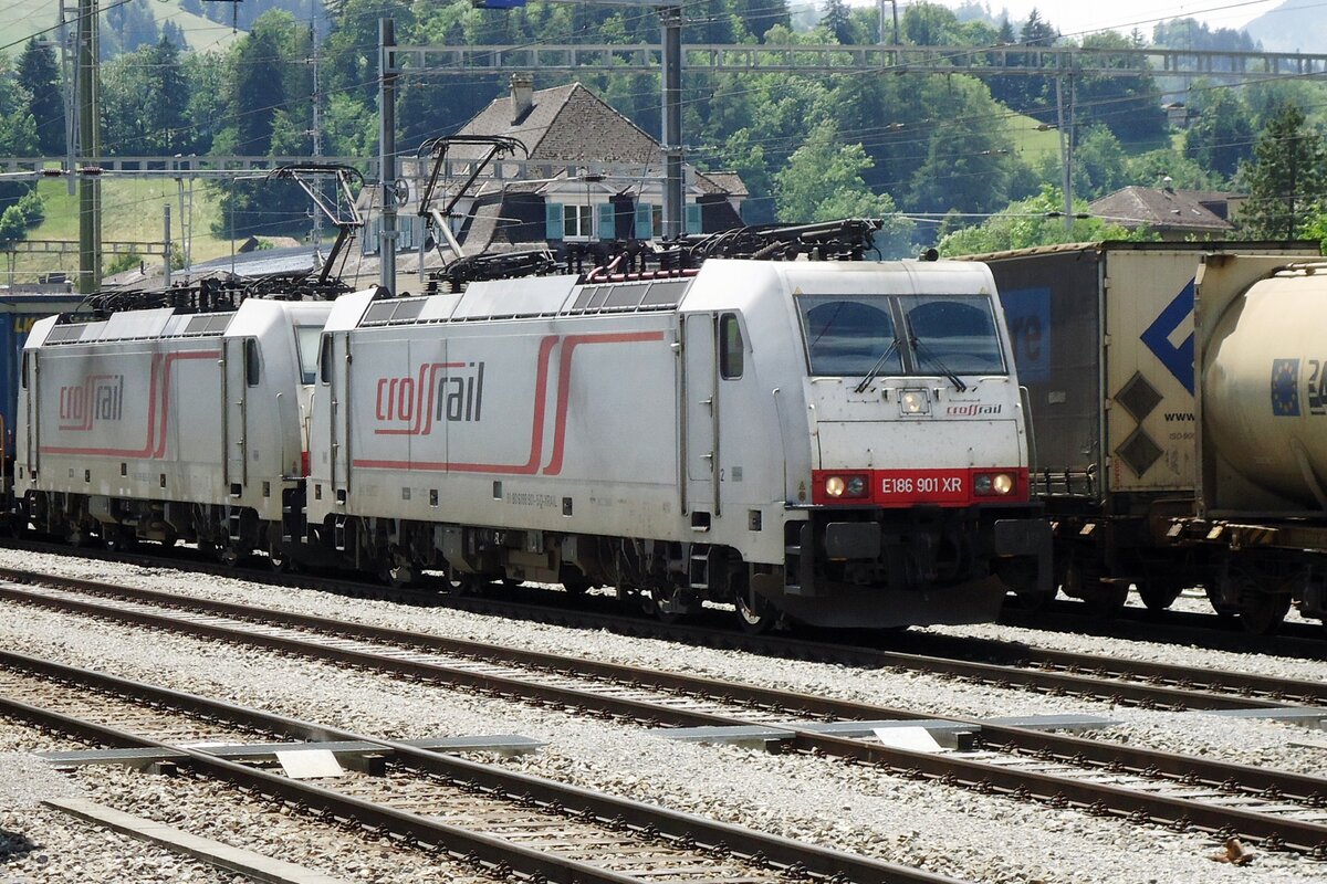 Crossrail/Rhenus 186 269 zieht ein KLV durch Tilburg-Reeshof am 10.Jänner 2025.