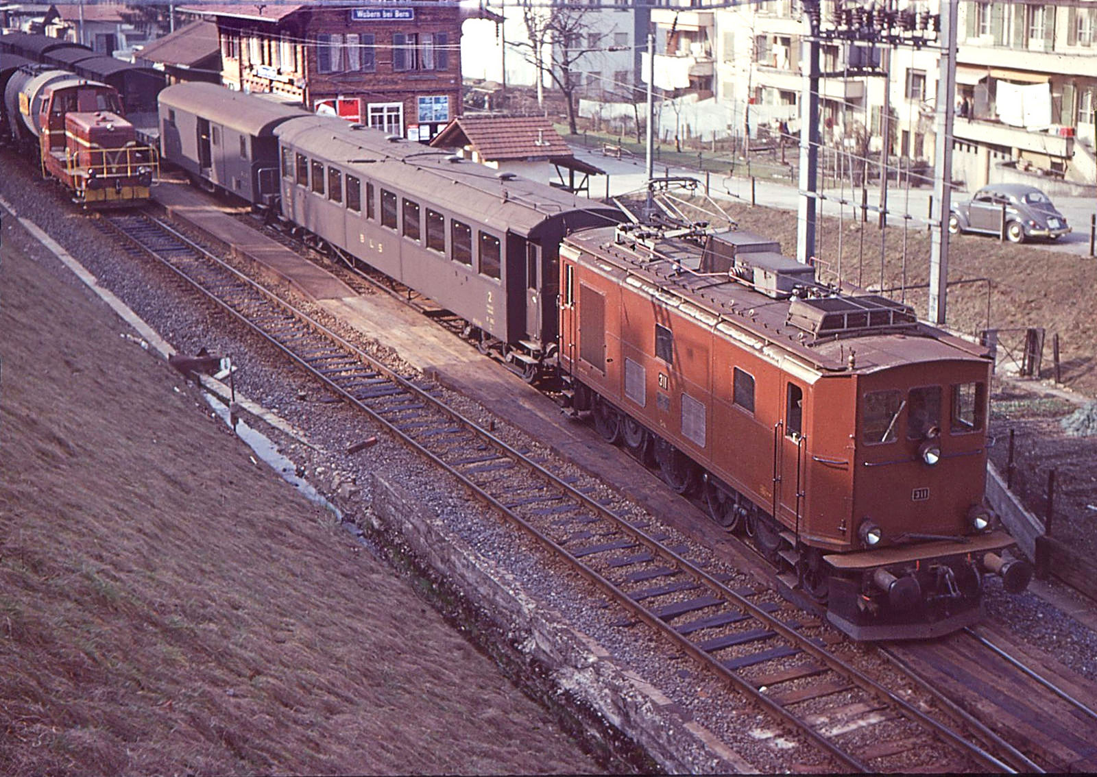 Schwere Altbauwagen der BLS: 1911/12 beschaffte die BLS 32 Wagen für den internationalen Verkehr mit Seitengang (20 AB4 und 12 C4) und 1914 für den innerschweizerischen Verkehr 9 C4 mit Mittelgang. Sie hatten Holzkasten mit Metallverkleidung. Ende 1940er/Anfang 1950er Jahre wurden 25 Seitengangwagen nach Umbau zu Mittelgangwagen. Einige dieser alten Wagen waren in den 1960er Jahren noch vorhanden. Im Bild steht Ce 4/4 311 mit einem Güterzug in Wabern, an erster Stelle ein alter BLS-Vierachser, möglicherweise B 885; ich vermute, er hat noch Holzkasten mit Metallverkleidung. Wabern, 8.März 1967. (Links noch die alte Gaswerkbahn Bern) Peter Ackermann