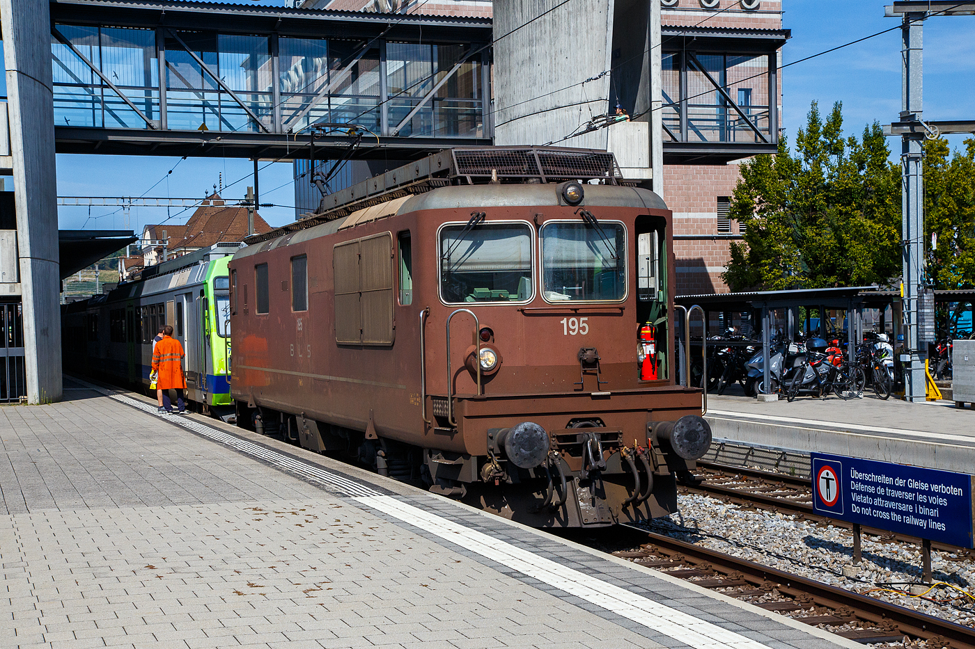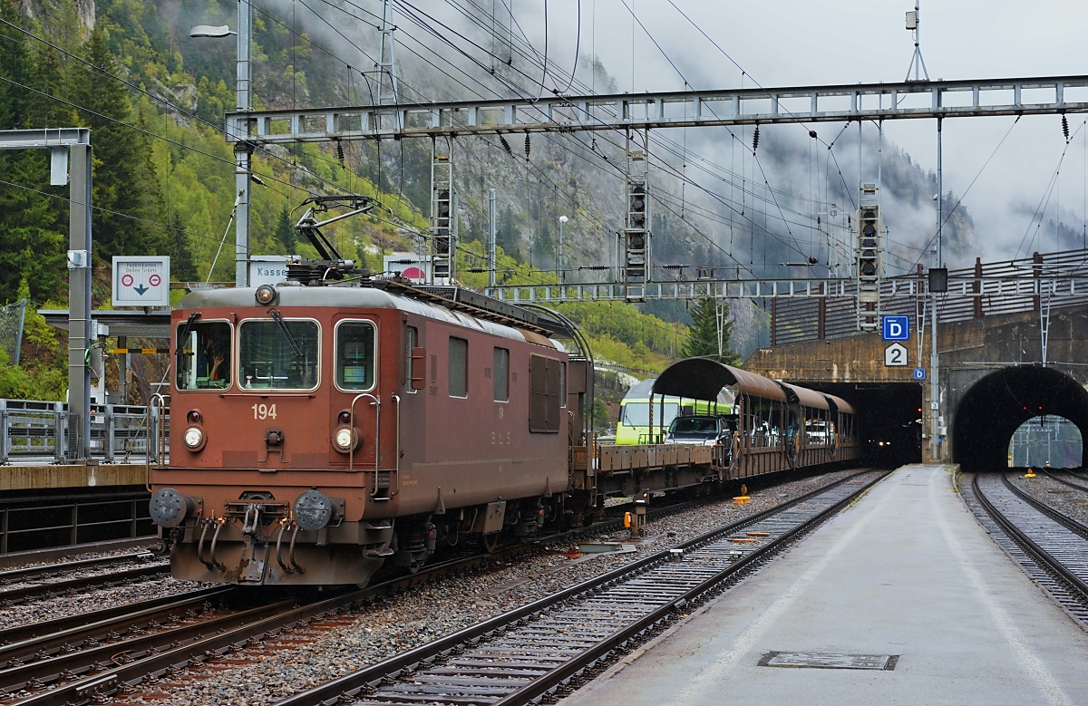 Ein eisiger Morgen in Goppenstein: BLS Re 4/4 175 wartet mit dem übernächsten Autozug nach Kandersteg, während Lötschberger 117 nach Brig ausfährt. 7.Januar 2021