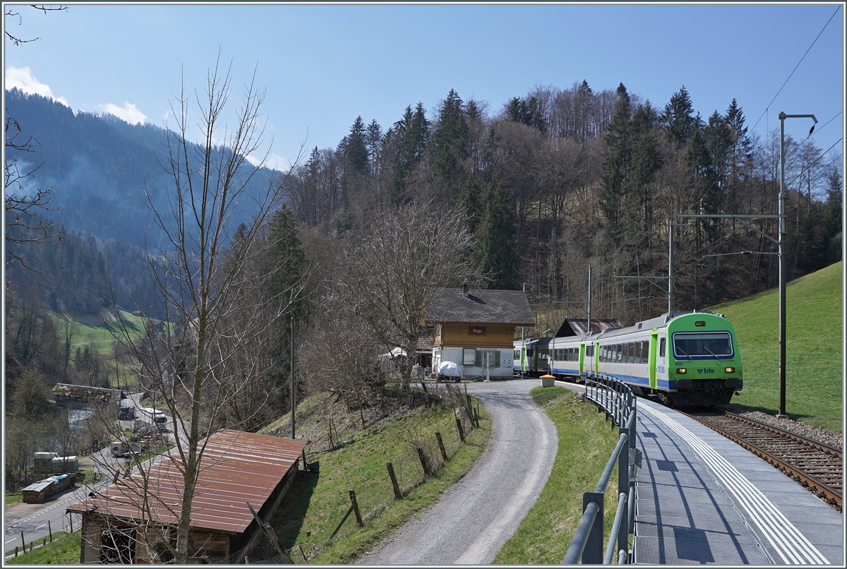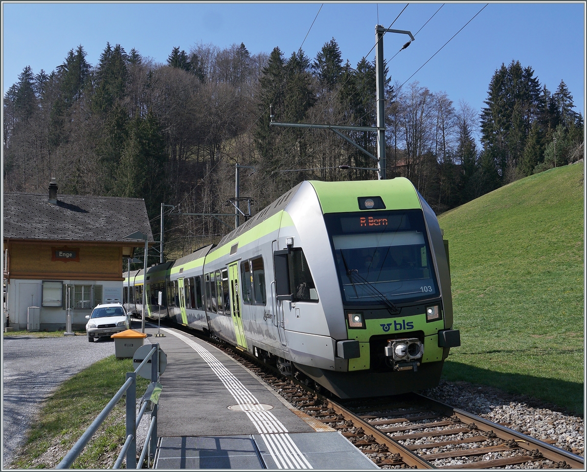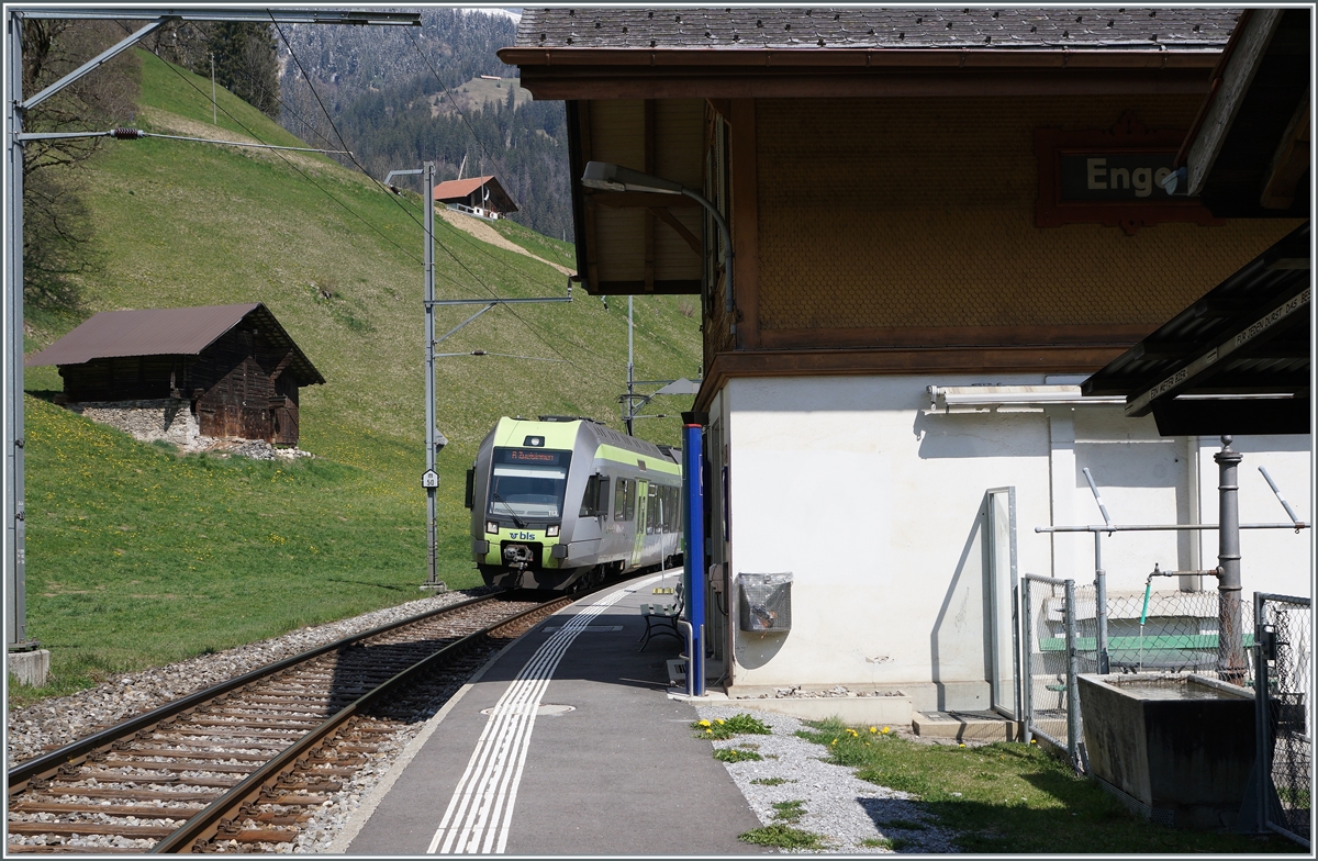 Die BLS Re 4/4 II 504 ist mit einem RE von Interlaken Ost nach Zweisimmen unterwegs und fährt gerade durch den Bahnhof Enge im Simmental.
