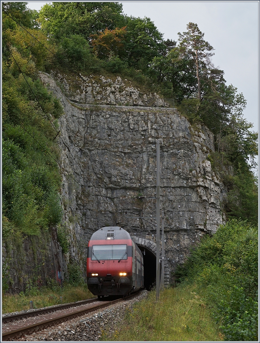 Im Sommer 2018 standen unter anderem auch auf der Hauensteinlinie Baumassnahmen an, so dass die "Alte Hauensteinlinie" in den Genuss von Umleitungsverkehr kam: Eine SBB Re 460 ist mit einem IR/IC bei Rümlingen auf dem Weg nach Basel SBB.