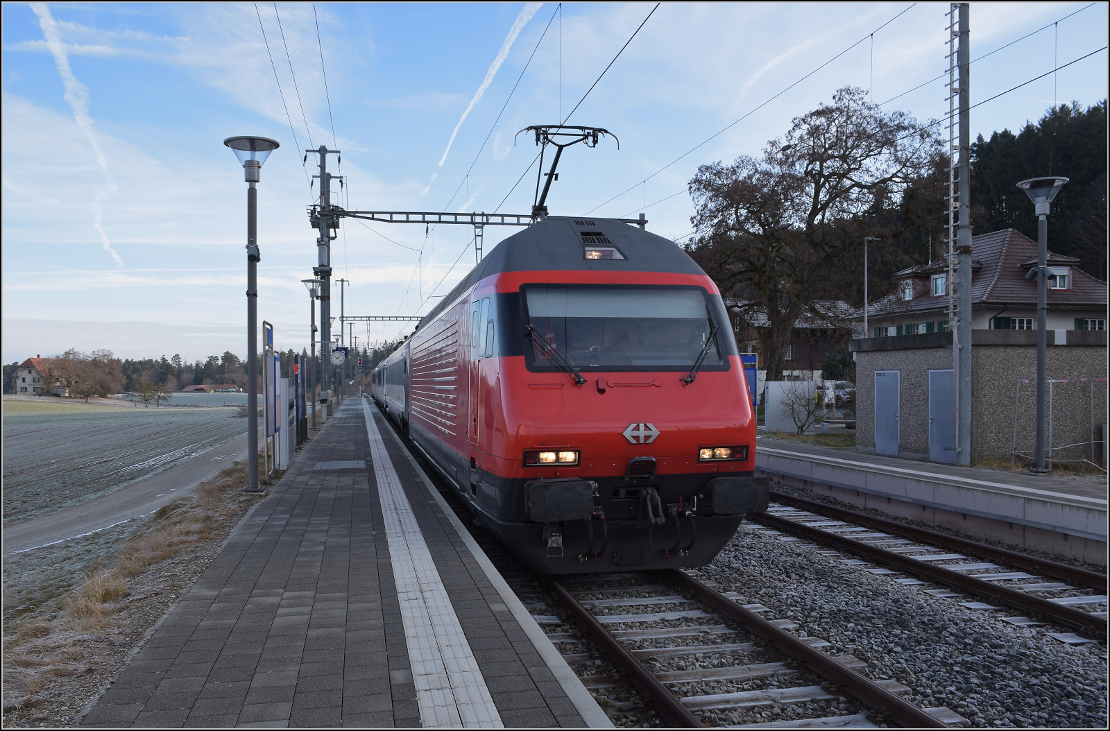 Die erste SBB Werbelok Re 460 015-1 "AGFA-FILM" wartet mit dem EC Mont-Blanc in Lausanne auf die Abfahrt.