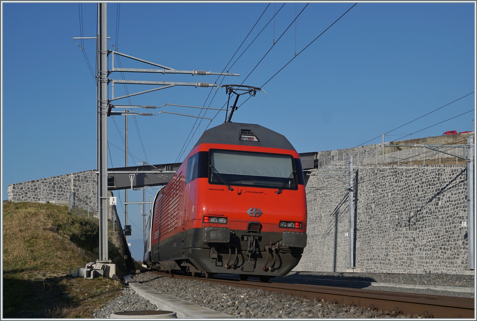 Eine SBB Re 460 ist in Cully mit einem IR90 in Richtung Genève Aéroport unterwegs.