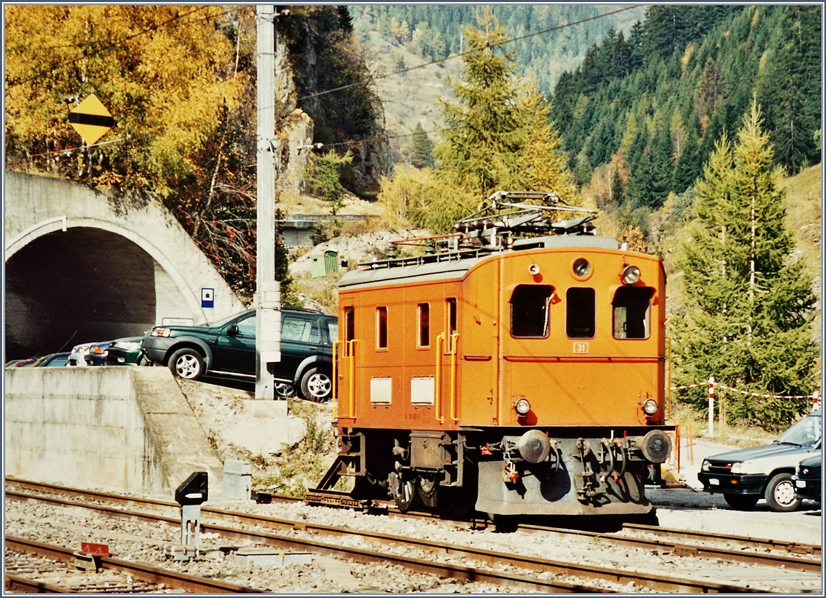 Als Ergänzung zu Ollis Bildern des BLS Te 2/3 31, einige Bilder aus der Einsatzzeit des BLS Te 215 031-6: Hier steht der Te 215 031-6 in Goppenstein. Oktober 2001