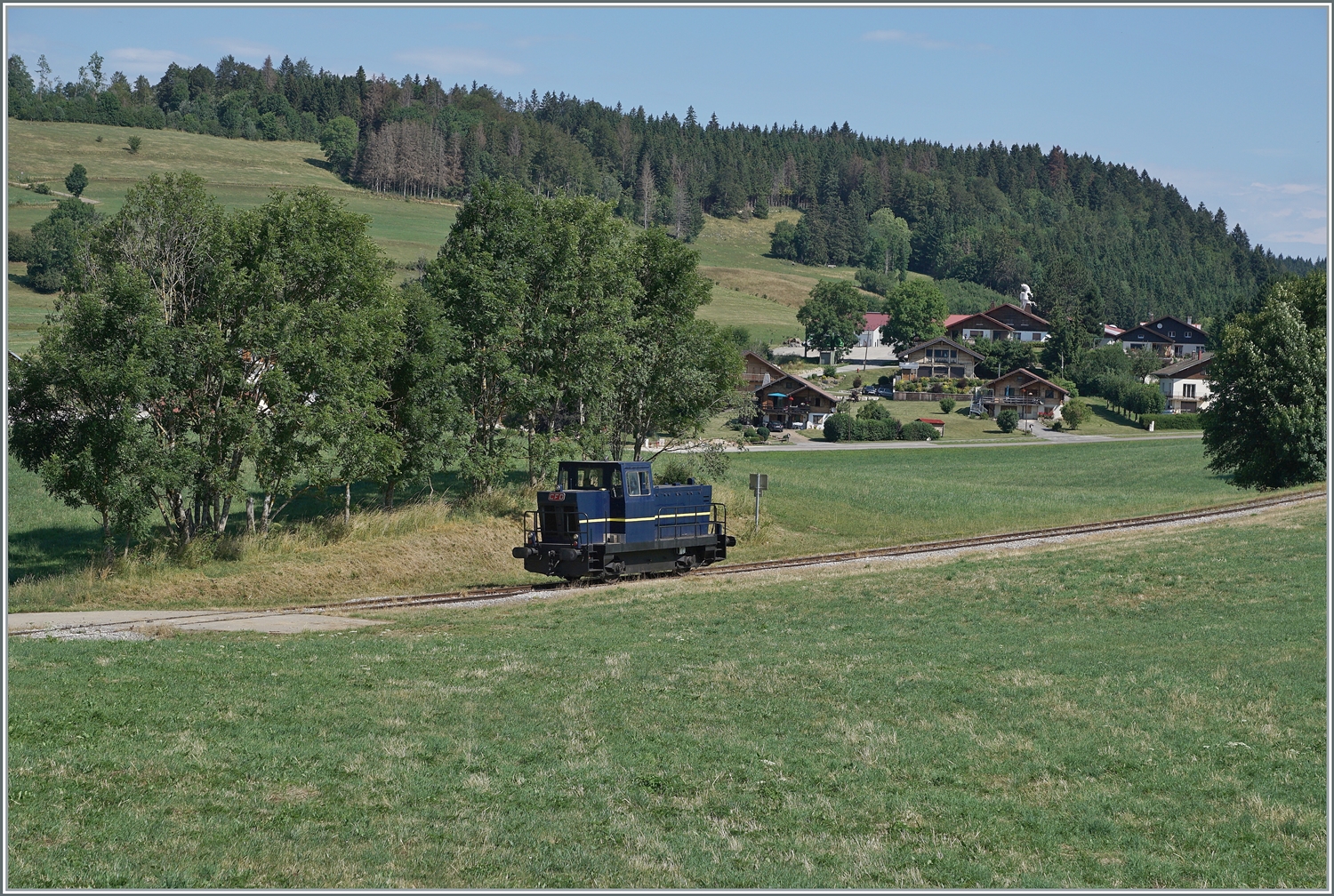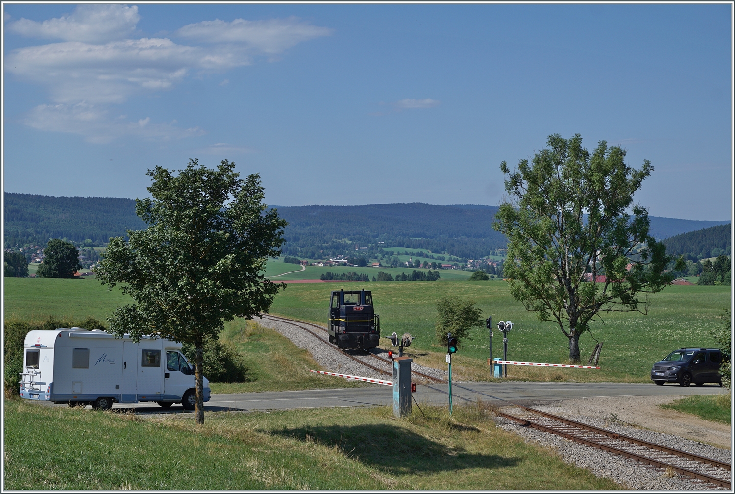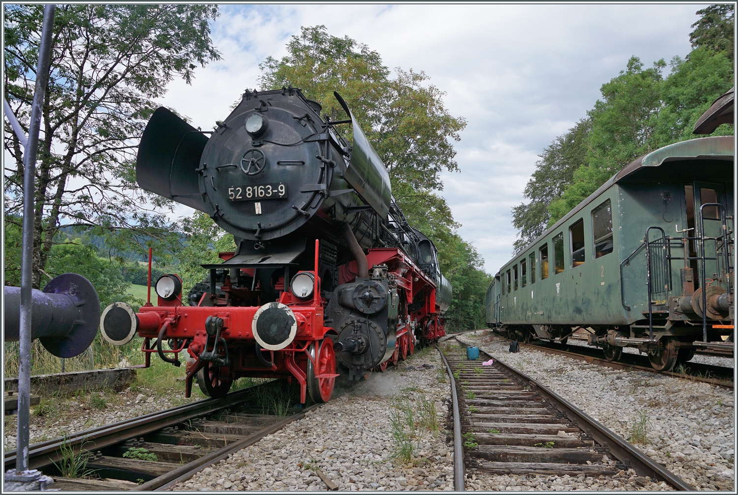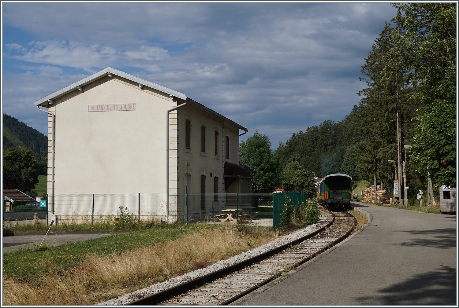 Abstecher zur Coni'fer. Ein Schweizer 3-Achser im Gewand des Orient-Express in Les Hôpitaux-Neufs. Mai 2023.