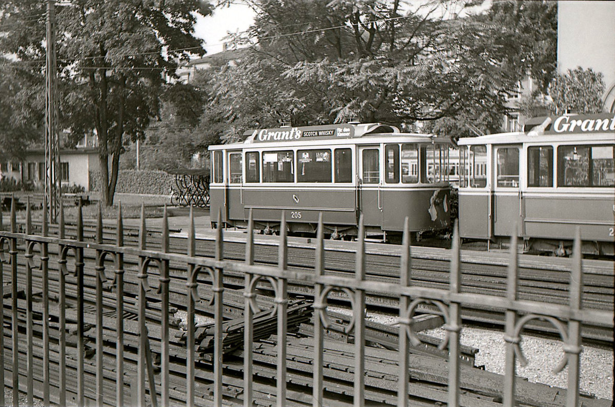 Die ehemalige Tramlinie 1 in Bern im Raum Brückfeld: Tramzug mit Motorwagen 146 und Anhänger 223 beim Engeried kurz vor der Endstation Brückfeld. Man beachte, dass der Anhänger leer und abgeschlossen ist; er wurde an der Endstation Güterbahnhof angehängt und wird vermutlich bei der Rückfahrt am Bahnhof dann geöffnet werden. 21.September 1965