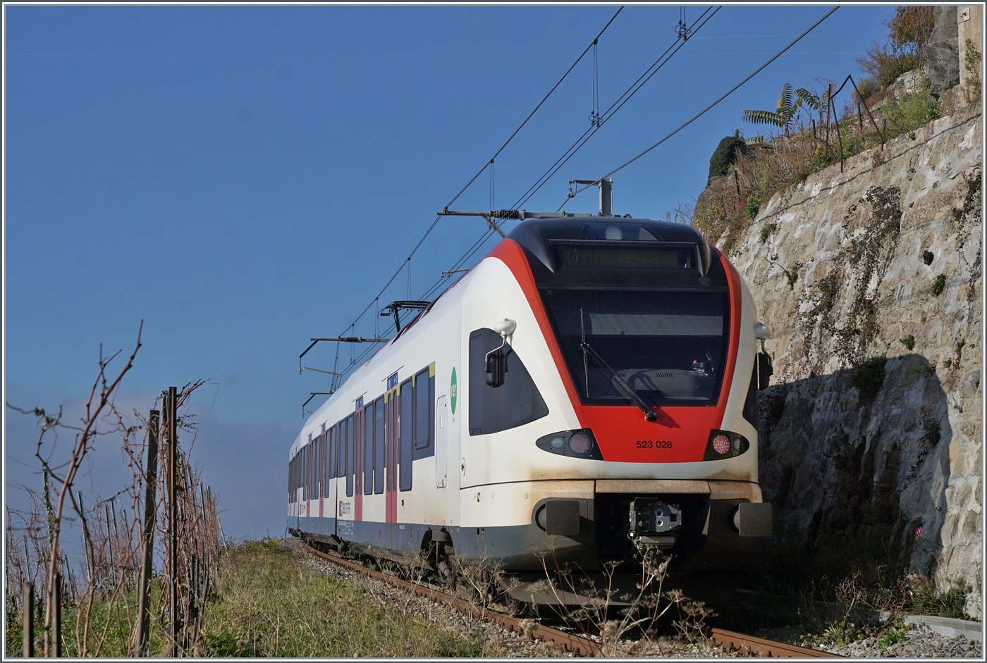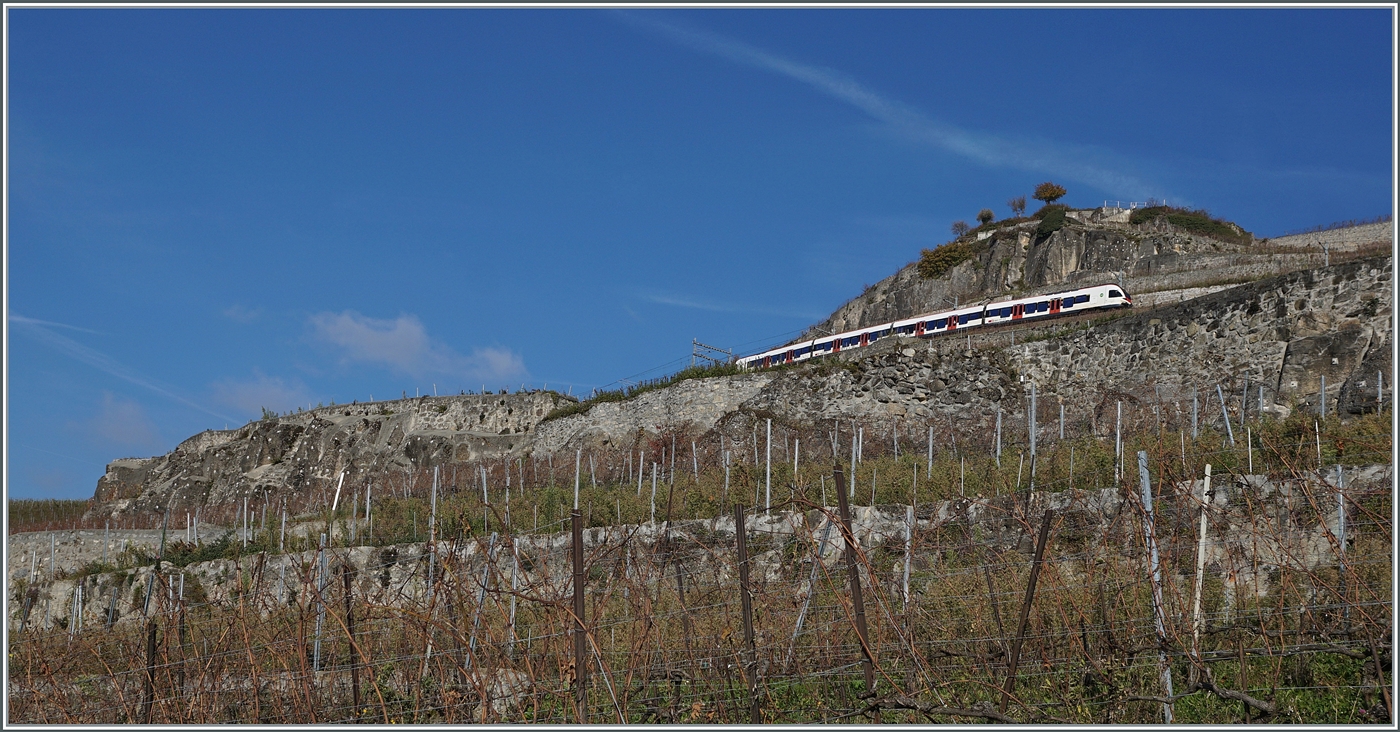 Der RBDe 560 131 "Train de Vignes" ist auf seiner Strecke hoch über dem Genfersee auf der Fahrt nach Vevey unterwegs.