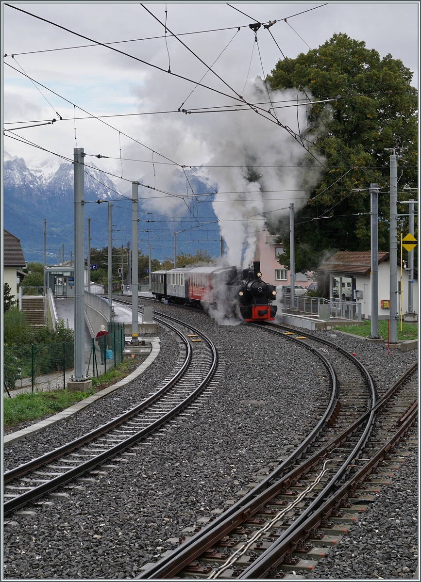 Der MVR ABeh 2/6 7505 beim Halt in St-Légier Gare, der Bahnhof ist nun (fast) fertig umgebaut und verfügt über eine nun gestreckt Gleisanlage mit längeren Überhohlgleisen und Schienenfreien Zugängen.