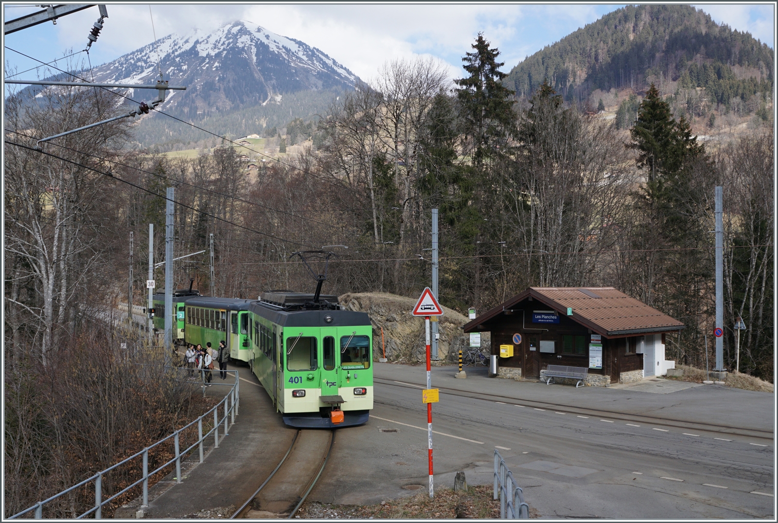 Danke der kleinen Reisegruppe die irrtümlich beim Bedarfshalt Les Planches ausstieg und somit den Zug zum Halten veranlasste, kam ich in den Genuss die BDe 4/4 404, Bt und BDe 4/4 401 beim Halt fotografieren zu können.