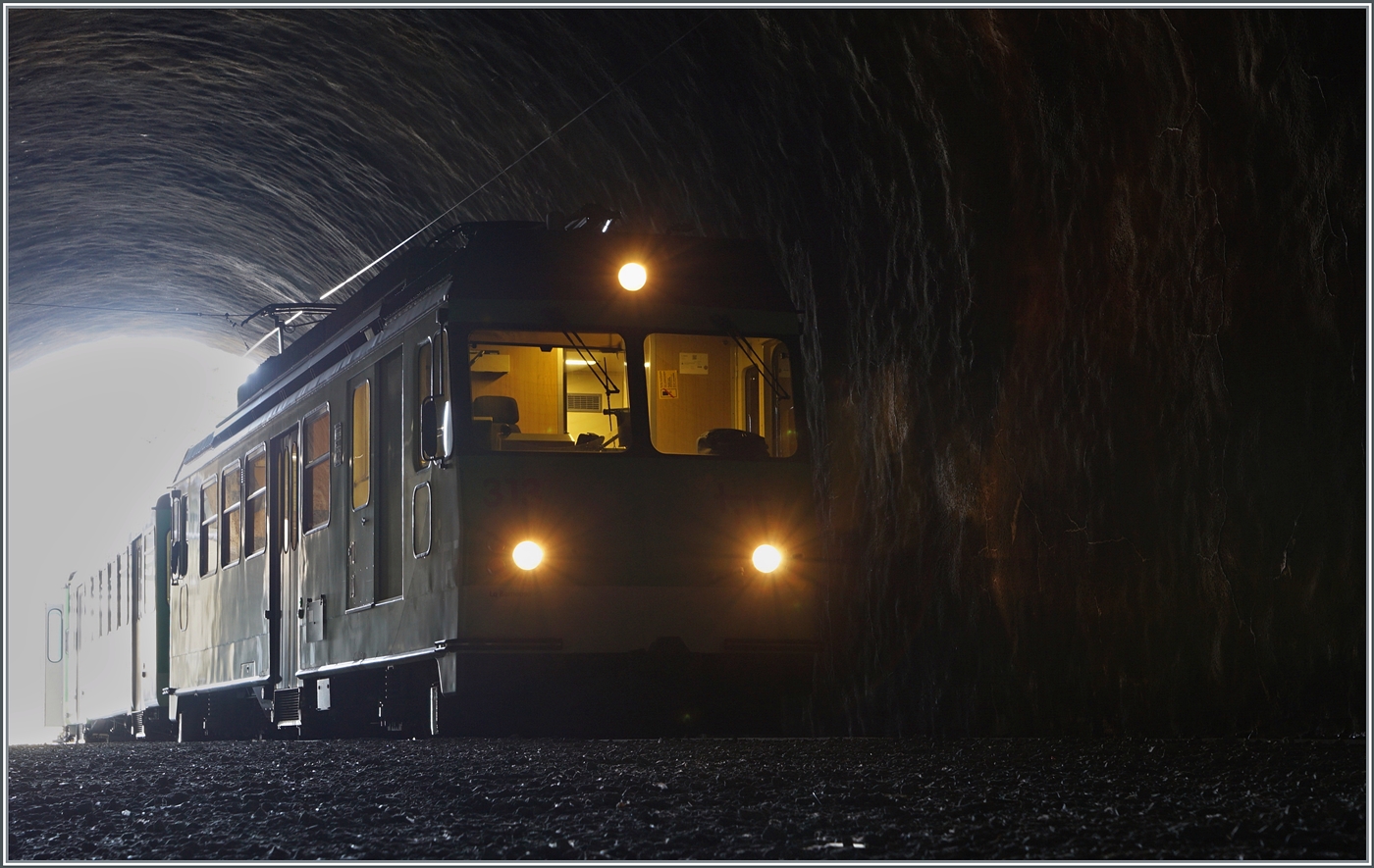 Der TPC AL BDeh 4/4 312 mit seinem Bt 361 ist von Aigle auf dem Weg nach Leysin kurz nach der Haltestelle Fontanney zu sehen. Im Vordergrund verläuft die Strecke der ASD.