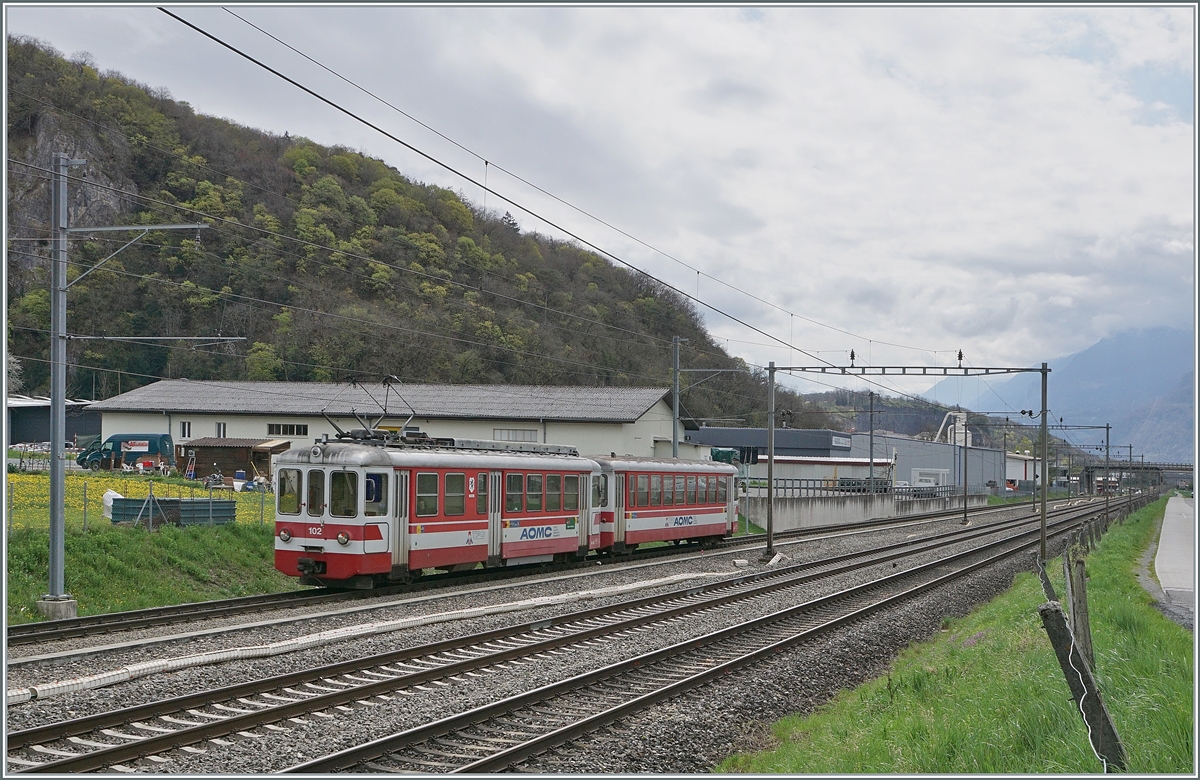 Der AOMC Be 4/4 101 (ex BLT) wartet in Monthey-Ville auf die Abfahrt Richtug Aigle.