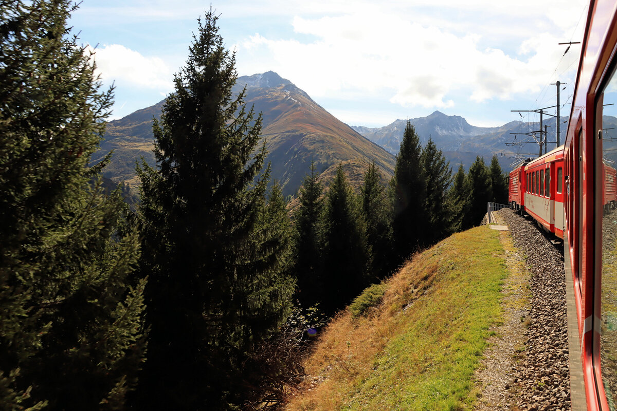 Matterhorn-Gotthard Bahn MGB: Was entsteht eigentlich da in Andermatt? Es sieht ziemlich grössenwahnsinnig aus. Einfahrt des Zuges vom Oberalppass her in Andermatt hinter HGe4/4 105. 21.September 2022