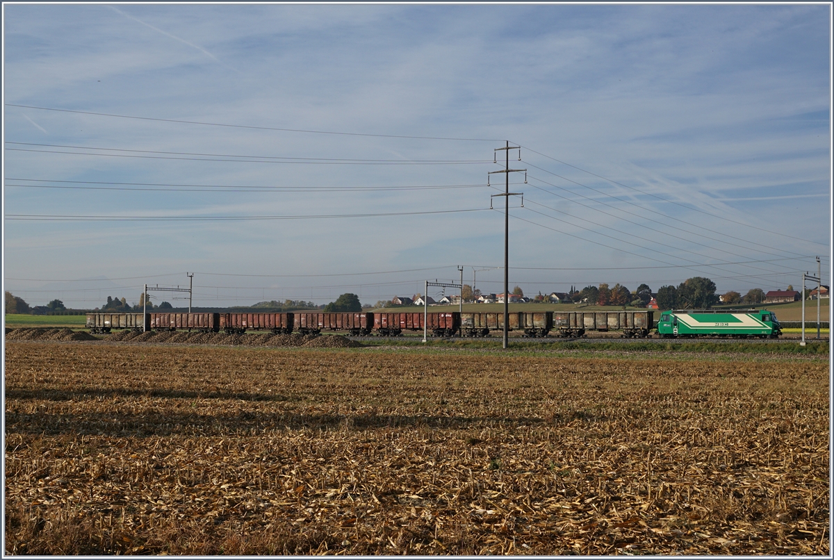 Die beiden BAM MBC Ge 4/4 21 und 22 ziehen bei der vor kurzem neu errichteten Bahnhof und Kreuzungsstelle Chigny (vorher nur eine Haltestelle) einen Kieszug Apples - Gland in Richtung Morges.